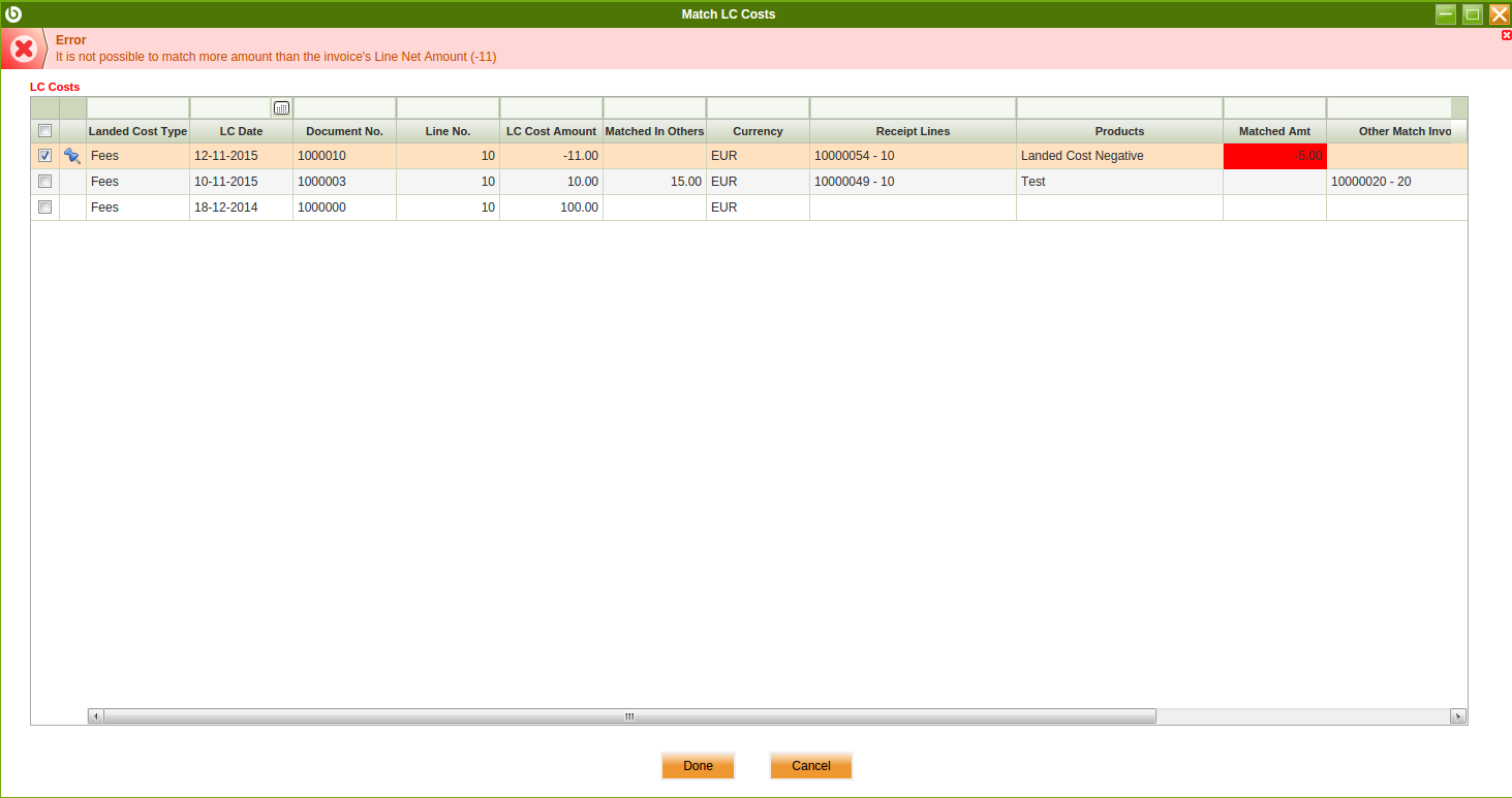 | Steps To Reproduce | In F&B International Group, F&B España org. Go to product window and create a new product named "Negative Landed Cost" for F&B España. Go to price tab and select "Tarifa Bebidas Alegres". Enter a net/list price = 100.00 Go to G/L item window and create a new one named "Customs", select "Enable in Financial Invoices" check and enter a Tax Category, for instance "Exempt". Save. Go to landed cost type window and create a new one named "customs", select Distribution by Amount in the field Landed Cost Distribution Algorithm. Select the account "customs" (that is the G/L item). Go to purchase order and create a new one for F&B España, for the product "Negative Landed Cost" enter 1 unit of the product. Book the order. Go to Goods Receipt and receipt that 1 unit of the product in a warehouse. Complete the goods receipt. Execute costing background process if needed so there is no doubt that the cost of the product "Negative landed cost" is calculated. Go to landed cost window and create a new one for F&B España. In Cost tab select "customs" landed cost type and enter an amount of -11.00. Go to Receipts tab and select the goods receipt previously created. Complete landed cost tab and check that a cost adjustment has been created for the product, for an amount o -11.00 (this can be checked in the Cost Adjustment window). Go to purchase invoice and create a new invoice for F&B España. Select the goods receipt by using "Create Lines From" button. Add a financial invoice line, select the account "Customs" and add a quantity of -1 at a price of 11.00 Complete the invoice. Do not use credit if any. Go to"Customs" item invoice line and check that "Match LC Costs" is shown. Click on that button. Select the line related to "Customs" landed cost type for a "LC Cost Amount" = -11. Enter a Matched Amt of = -5.00. Press Done. Check that below error is shown. It is not possible to match more amount than the invoice's Line Net Amount (-11.00), because it is not properly managing negative values. | |||||||||||