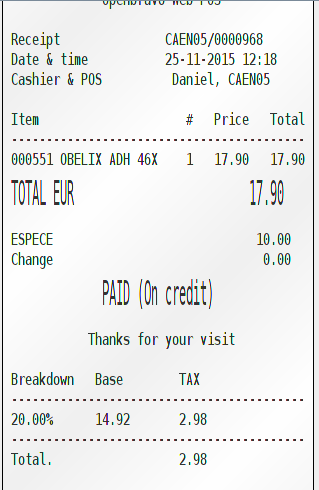 | 2015-12-01 11:01 | agete | Summary | The payment on credit doesn't appear in the printing receipt as a payment line => [SER-QA 406] The payment on credit doesn't appear in the printing receipt as a payment line |