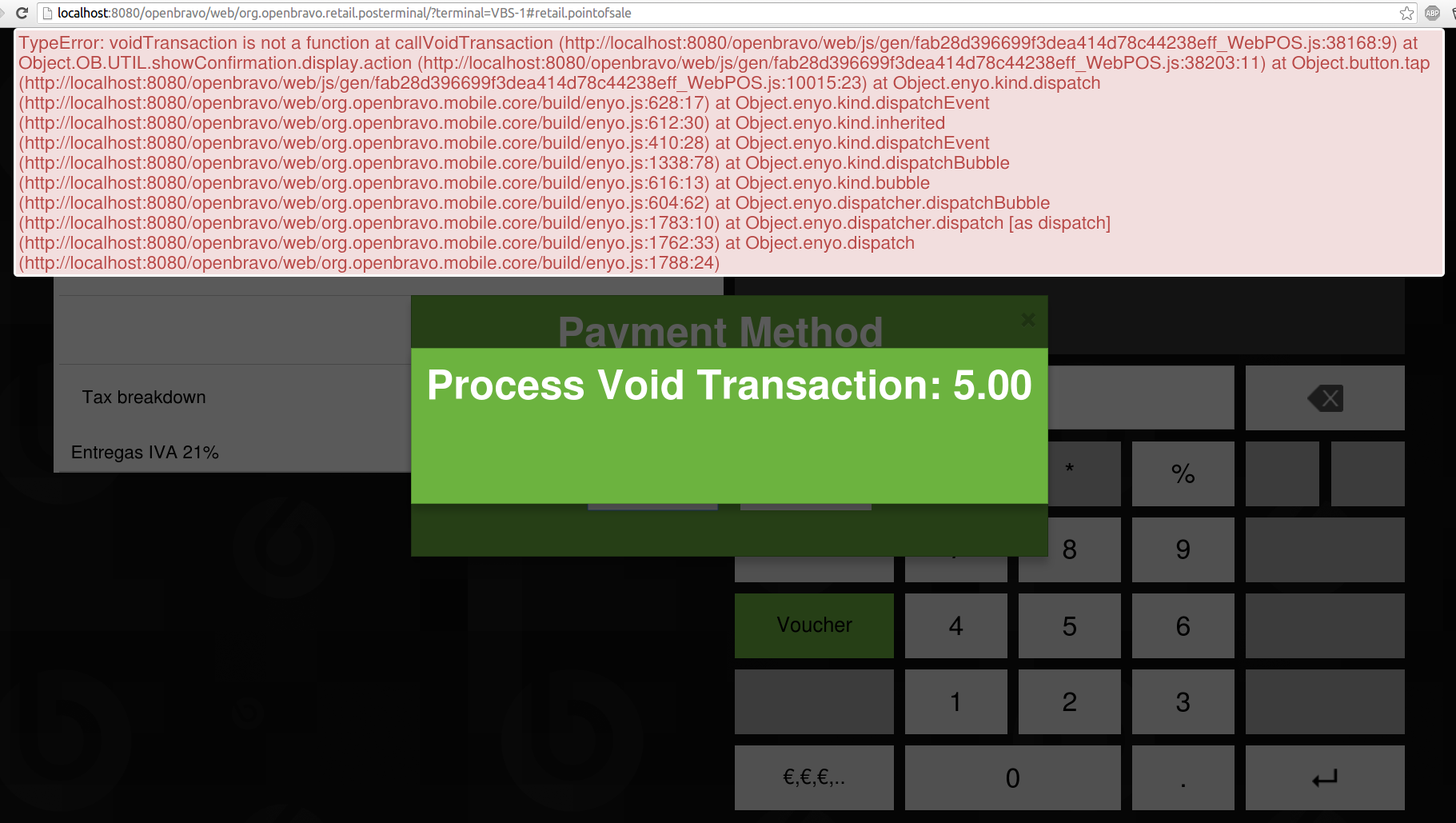 | Description | Cancel a payment with paymentData and no VoidTransaction function creates an error. Error: TypeError: voidTransaction is not a function at callVoidTransaction (fab28d396699f3dea414d78c44238eff_WebPOS.js:38168) at Object.OB.UTIL.showConfirmation.display.action (fab28d396699f3dea414d78c44238eff_WebPOS.js:38203) at Object.button.tap (fab28d396699f3dea414d78c44238eff_WebPOS.js:10015) at Object.enyo.kind.dispatch (enyo.js:628) at Object.enyo.kind.dispatchEvent (enyo.js:612) at Object.enyo.kind.inherited (enyo.js:410) at Object.enyo.kind.dispatchEvent (enyo.js:1338) at Object.enyo.kind.dispatchBubble (enyo.js:616) at Object.enyo.kind.bubble (enyo.js:604) at Object.enyo.dispatcher.dispatchBubble (enyo.js:1783) at Object.enyo.dispatcher.dispatch [as dispatch] (enyo.js:1762) at Object.enyo.dispatch (enyo.js:1788); line: Object.OB.UTIL.showError (http://localhost:8080/openbravo/web/js/gen/fab28d396699f3dea414d78c44238eff_WebPOS.js:10150:6 [^]) (*,+)processConsoleLevel @ fab28d396699f3dea414d78c44238eff_WebPOS.js:2522 fab28d396699f3dea414d78c44238eff_WebPOS.js:38168 Uncaught TypeError: voidTransaction is not a function | |||||||