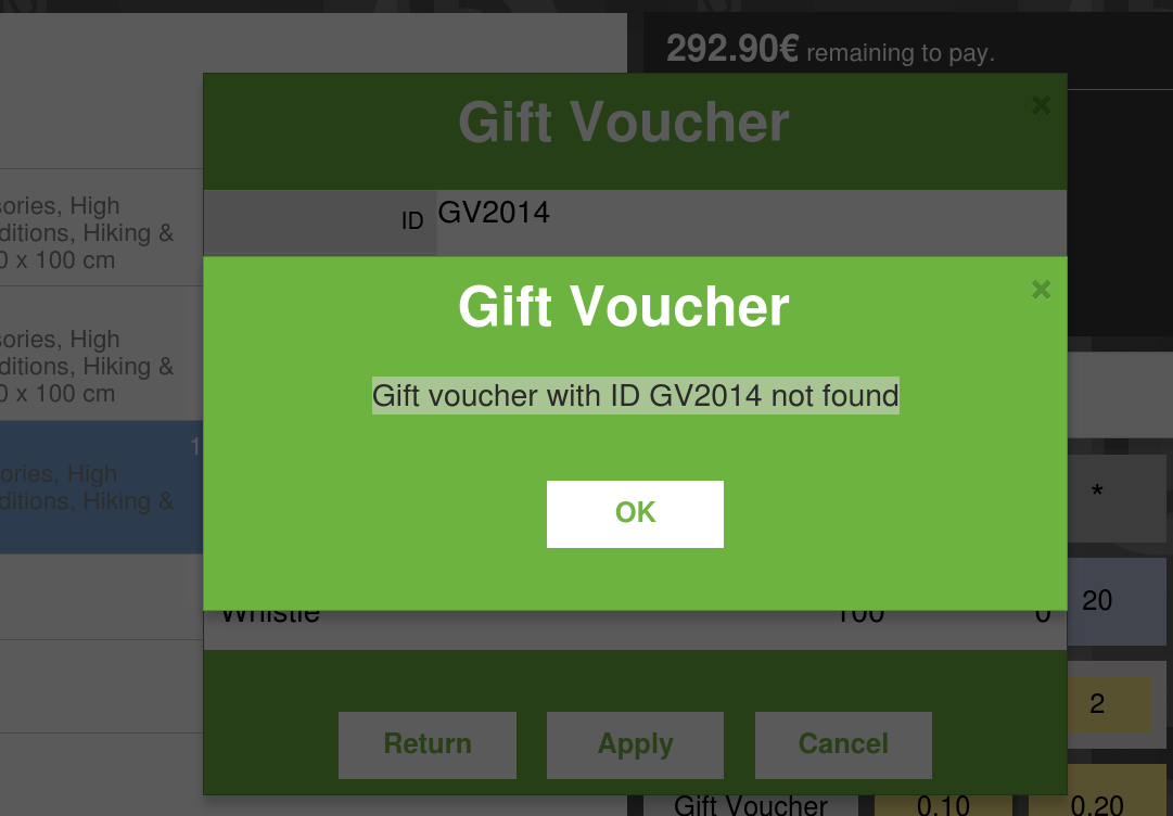 | Description | When POS user tries to apply an already closed Gift Voucher, it is show "Gift voucher with ID GV2014 not found" (GV2014 is the ID of the example Gift Voucher) instead of the right message: “Cannot use a gift voucher which is closed already”. | |||||||||||