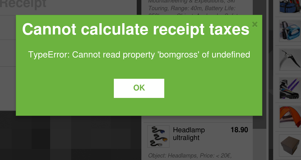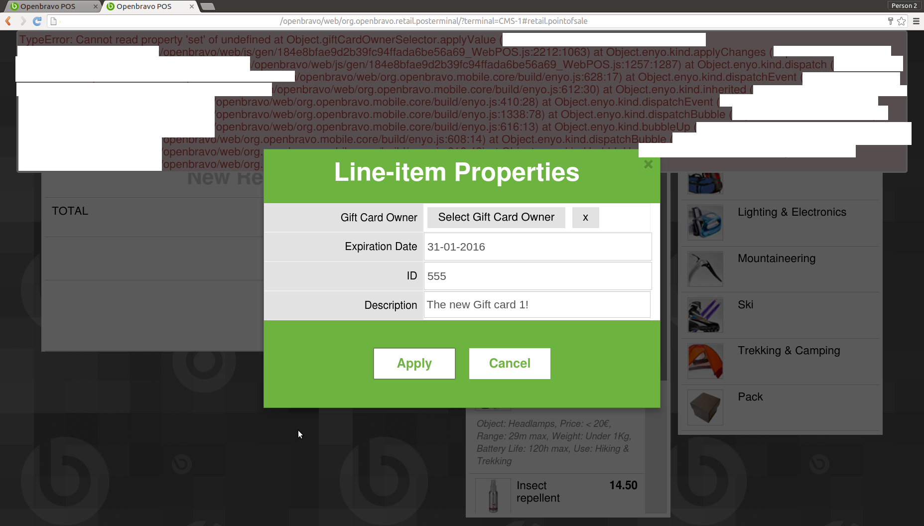 | Steps To Reproduce | 0-With "New Entities For Gift Cards" modules installed, and a Gift Card created to use it later in POS, login POS backend as Openbravo. 1-Using "The White Valley Group Admin" role, go to "Product" window and select the previously created Gift Card and watch it in from view. 2-In "Expires After (days)" field, enter "15". In "Tax Category" input field, choose "As per BOM" (not the usual casuistry, but it is possible to be selected). Save the record. 3-Login POS as vallblanca. 4-Search the previously aforementioned Gift Card and click it to add it to the receipt. 5-When "Line-item Properties" popup appears, add "1234" in ID field and "Testing" as Description. Then click "Apply" button. DEFECT: It is not possible to sell the Gift Card and an uncaught exception appears. Besides, if the popup is closed, the following message appears: "Cannot calculate receipt taxes TypeError: Cannot read property 'bomgross' of undefined". | |||||||