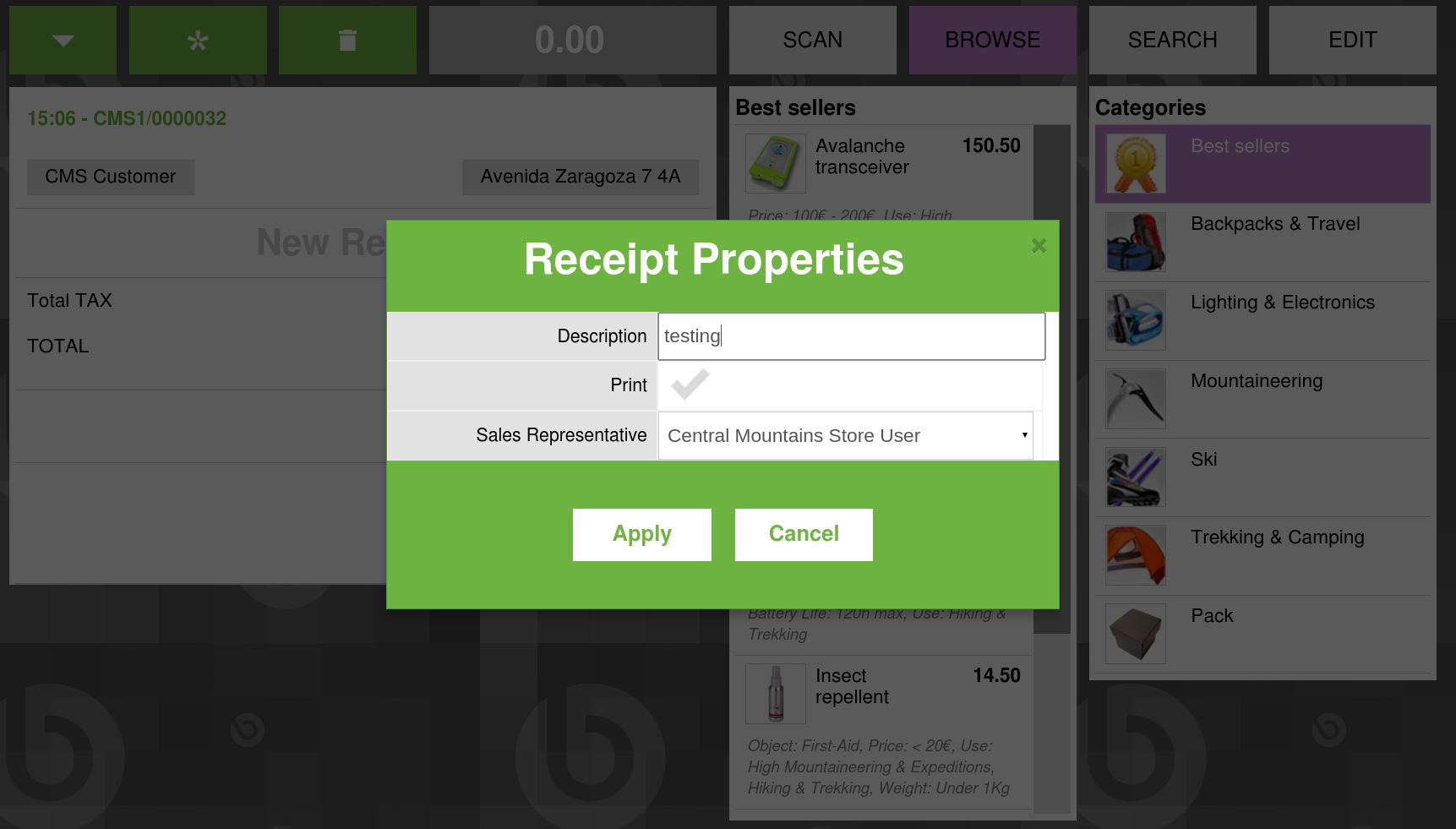 | Description | Cancel, 'x' and clicking outside from the "Receipt Properties" popup have the same behaviour than clicking "Apply" button. | |||||||||||