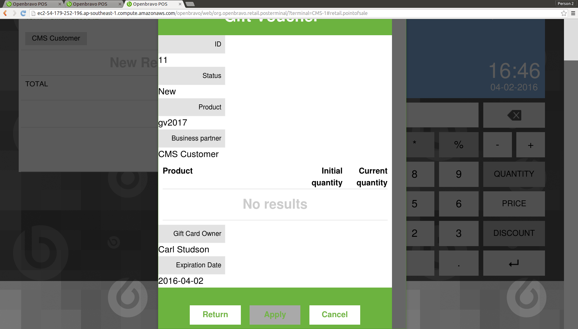 | Description | Every twice in a row POS user goes to "Gift cards/vouchers" popup to check Gift Voucher details, the layout gets broken. Sometimes at the first time it gets broken, other times, it must be tested twice in a row. | |||||||||||