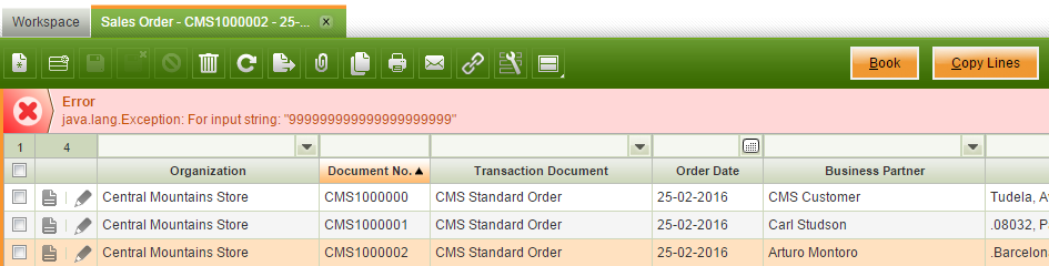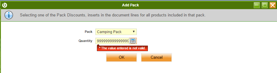 | Steps To Reproduce | 1. Login as WhiteValley Admin user 2. Go to Sales Order window 3. Create a header for any valid customer and save. 4. Click the button labelled "Add Pack" 5. A pop up is shown. 6. Check the field Quantity. Verify it is capped to 9999. (See attached image) 7. Click the calculator icon to open the numeric pad. 8. Enter twenty nines: 9999999999999999999 9. Click the equal sign to accept 10. A message "The value entered is not valid" is shown (See attached image) 11. Click the Ok button 12. An exception is shown: java.lang.Exception: For input string: "999999999999999999999" (See attached image) | |||||||||||
