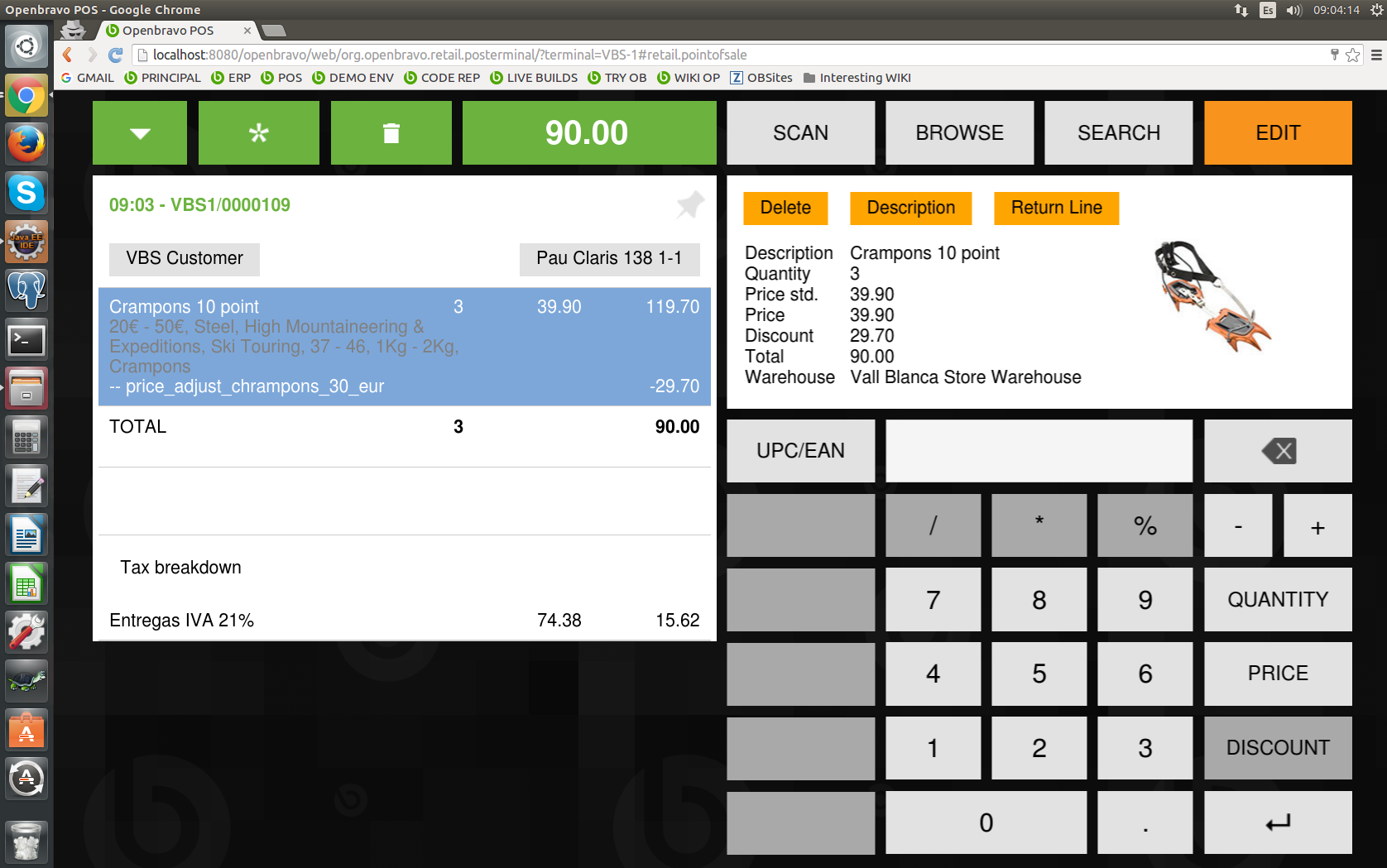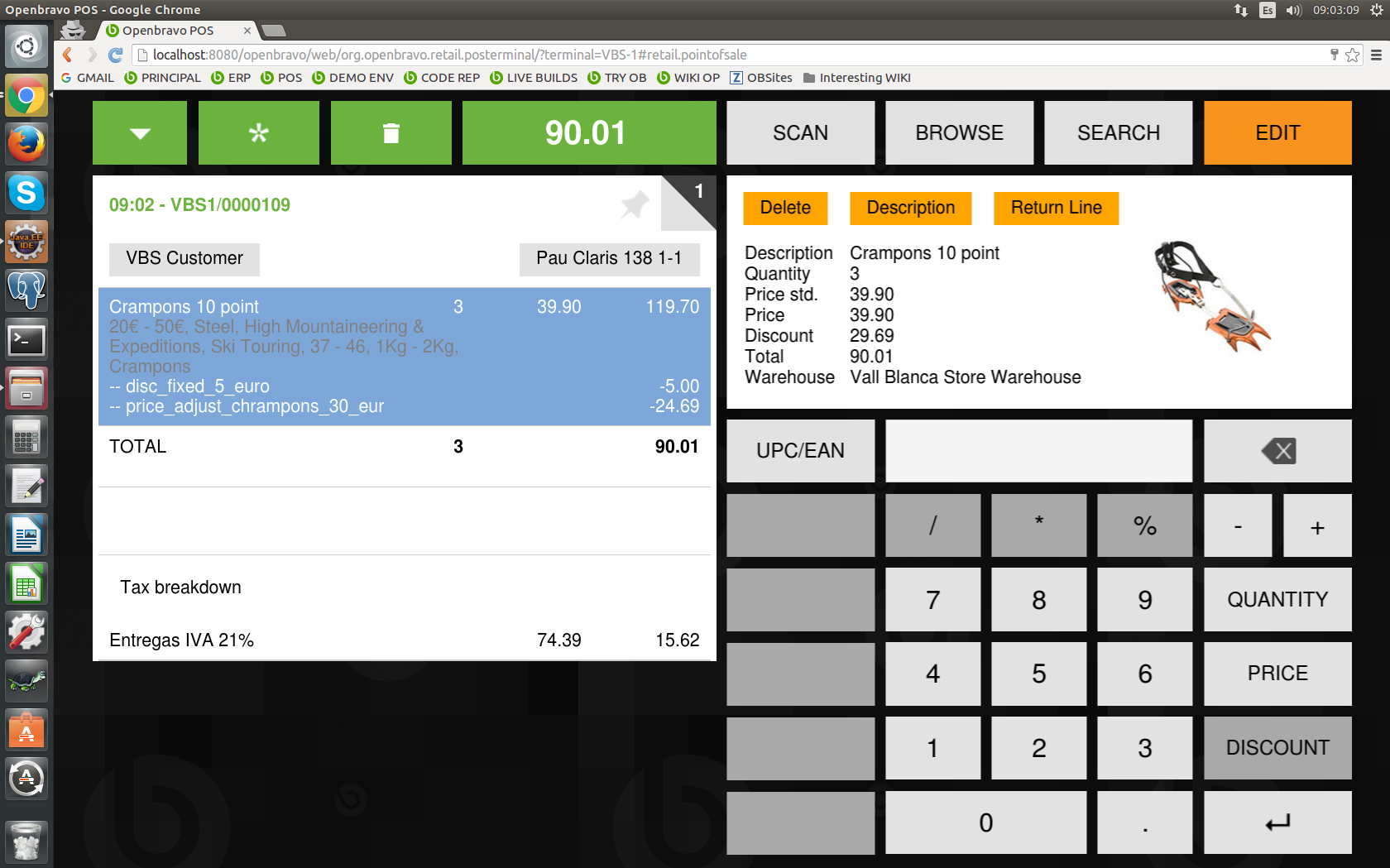| Steps To Reproduce | 1 - Login in the WEBPOS 1.1 - Go to the menu and click on Create Quotation 1.2 - Go to the search tap and serach Crampons 10 points. 1.3 - Add three units of that product and check a discount price_adjust_chrampons_30_eur is applied. 1.4 - Go to the menu and click on Receipt discounts. Apply a disc_fixed_5_euro discount to the line. 1.5 - Check both discounts are applied, one of -5€ and the other one -24.69 1.6 - Click the pay button and check the quotation status is Under Evaluation 1.7 - Close the ticket and search the Quotation from the menu 1.8 - Go to the menu and click on the Create Sales Order. A popup is shown: 1.8.1 - If Firm Quotation is checked, when the Create Order button is clicked, promotions don't have to change. See attached image[1]. 1.8.2 - If Firm Quotation is uncheked, when the Create Order button is clicked, promotions and prices must be updated (only automatic promotions for the products must be shown). See attached image[2]. | |||||||