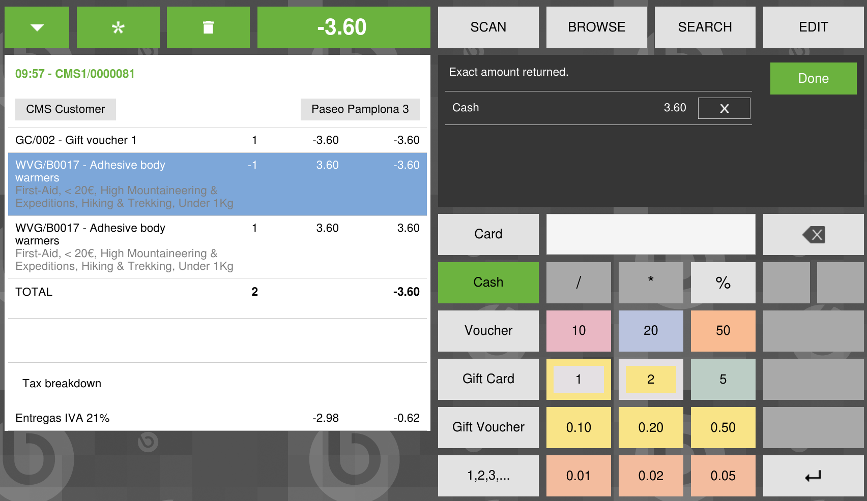 DescriptionTo complete the flow where a product is sold, a Gift Voucher is used to pay it and another copy of the first product is returned is pretty hard to achieve by the Web POS user. One of the main problems to achieve this flow is the following: