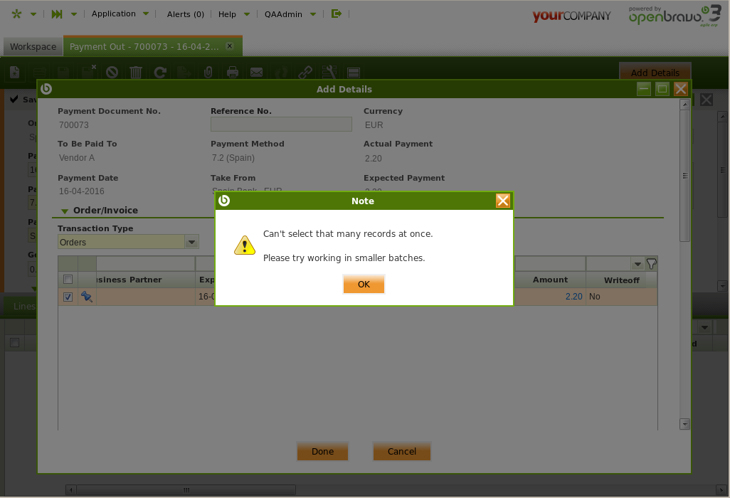| Description | In the "Payment Out" process as tested by the APRRegression29532Out.java test case, when selecting "Orders" Transaction type in the "Add Details" window, a "Note" popup is shown which says that it isn't possible to select many records at once. This is due to trying to click on the Select All checkbox on the first grid before the application has any chance of loading the filtered data, and although a workaround has been coded to prevent this situation from happening (by adjusting timing between instructions), there might be a better solution to this which exceeds our scope of coding. Could be an issue with SmartClient. This issue is reproducible in all PI builds as tested by the automated tests (with Postgres and Oracle). | ||||||||||