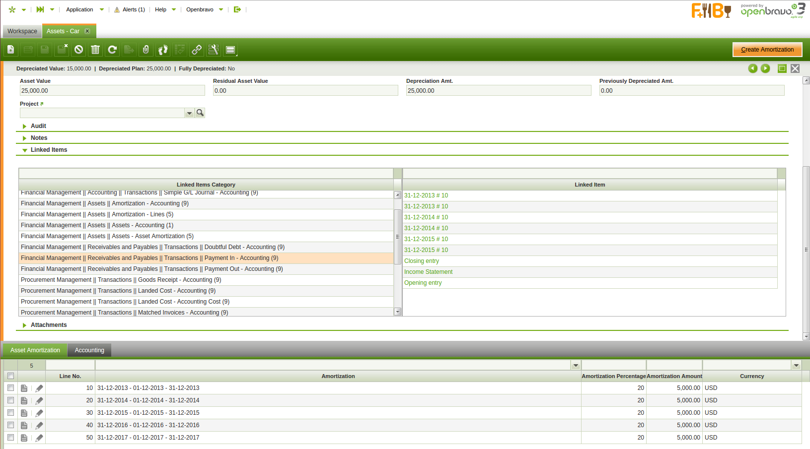 | Steps To Reproduce | As F&B Admin go to Asset window. Select F&B US assets. Select Car asset. Open in form view. Open Linked items section and realize that there are many linked items related in there which do not have nothing to do with asset amortization accounting. See image attached. | |||||||||||