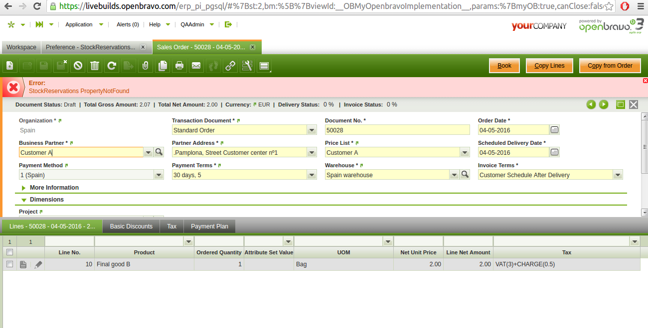 | Steps To Reproduce | 0-Login ERP as QAAdmin//QAAdmin. 1-Using "QA Testing Admin" role, go to "Preferences" window. 2-Create a new record with the following values: -- Organization: * Property: Enable Stock Reservations Value: Y Visible at User: QAAdmin -- Save that record. 3-Create a new record with the following values: -- Organization: * Property: Enable Stock Reservations Value: Y Visible at User: Sales A -- Save that record. 4-Go to "Sales Order", create a record with the following values: -- Transaction Document: Standard Order Business Partner: Customer B -- 5-Go to "Lines" tab and create a record with the following values: -- Product: Final good B. -- 6-Click "Book" process and click OK button in the popup to confirm the booking. DEFECT: An error will appear and that process is not completed. | |||||||