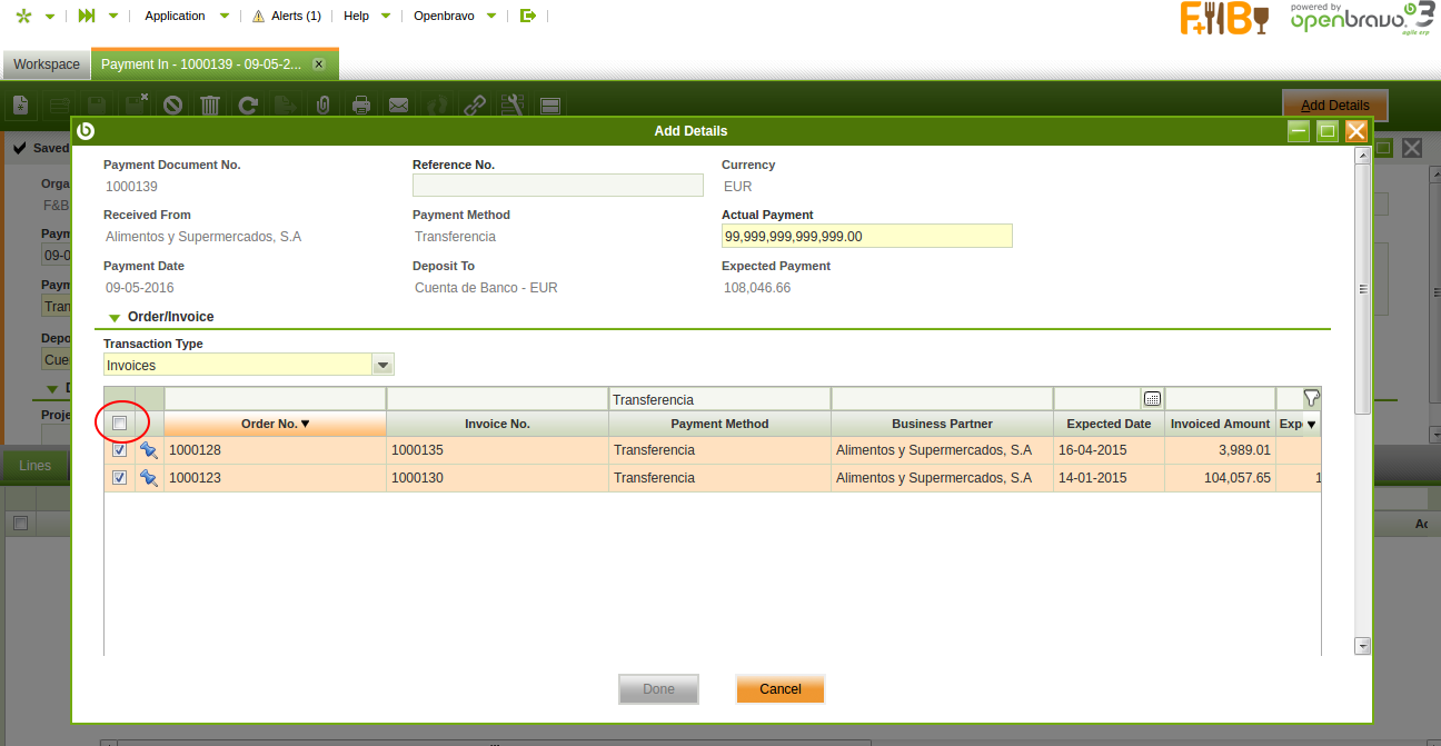 | Steps To Reproduce | 1-Login ERP as Openbravo//openbravo. 2-Using F&B admin role, go to "Payment In" window. 3-Create a new record with the following values: -- Received From: Alimentos y Supermercados, S.A Amount: 99999999999999 -- Save the record. 4-Click "Add Details" process button. 5-There, all checkbox are correctly activated. Now, click "Order No." filter column. DEFECT: selectAll checkbox is deselected. | ||||||||||