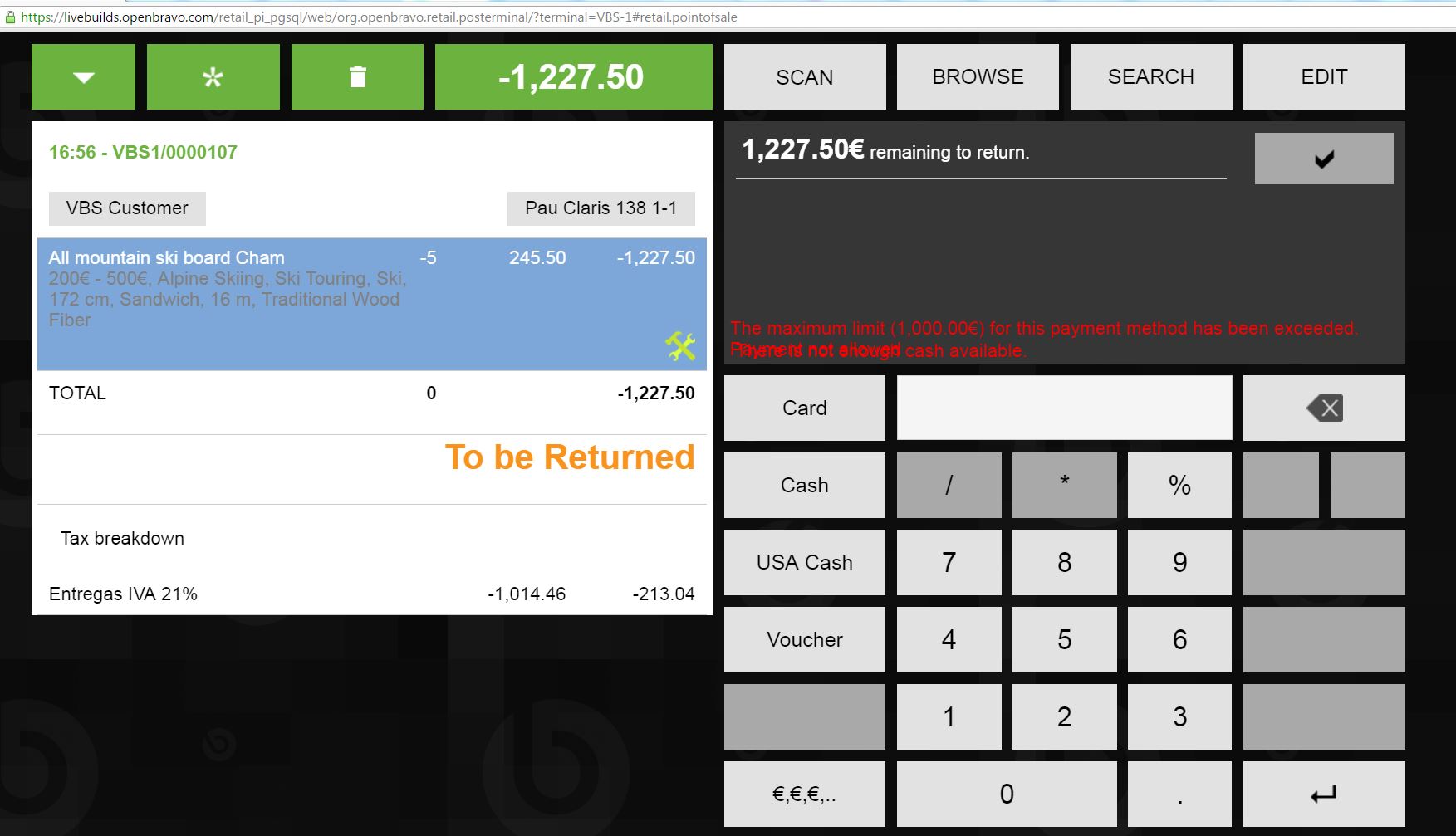 1. In backend, for the POS Terminal type 'VBS POS Terminal Type' and payment method 'Cash' set 'Max. Limit Amount'=1000.