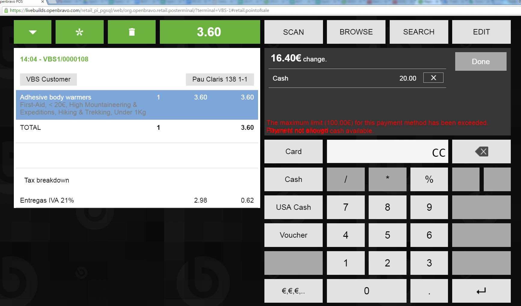 | Steps To Reproduce | 1. In webpos, for the terminal VBS-1, check in 'Cash Management' that the available cash is 0. If it is not, leave it as 0 doing a sale. 2. In backend, for the POS Terminal Type 'VBS POS Terminal Type', for the payment method 'Cash' set 'Max. Limit Amount' = 100. 3. In webpos, for the terminal VBS-1, create a ticket with the product 'Adhesive body warmers'. 4. Pay the ticket with an amount of 20€. Check that the message 'There is not enough cash available.' is displayed. 5.Without delete the previous payment, enter a new payment in cash of 200€. Check that the message 'The maximum limit (100.00€) for this payment method has been exceeded. Payment not allowed' is displayed. ERROR: both messages are overlapped. | |||||||