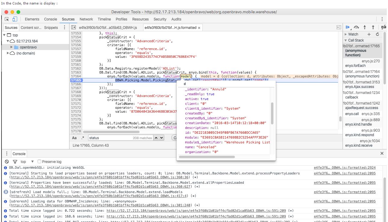| Steps To Reproduce | Install modules Mobile warehouse picking [1] and French translation [2] [1] http://centralrepository.openbravo.com/openbravo/org.openbravo.forge.ui/ForgeModuleDetail/Mobile-Warehouse-For-Picking [^] [2] http://centralrepository.openbravo.com/openbravo/org.openbravo.forge.ui/ForgeModuleDetail/Translation-FrenchFrance-Fr_FR [^] 1. In https://livebuilds.openbravo.com/retail_modules_pgsql_pi [^] create a Sales order for the organization Yosemite Store with a product 'Baby Carrier' and book the order. 2. Execute 'Generate Picking list' for the 'Picking List type'= Outbound Picking List. 3. Assign the warehouse picking list to the Demouser. 4. Login in https://livebuilds.openbravo.com/retail_modules_pgsql_pi/web/org.openbravo.mobile.warehouse/#login [^] with demouser with language French. ERROR: Check that status is not translated. | |||||||