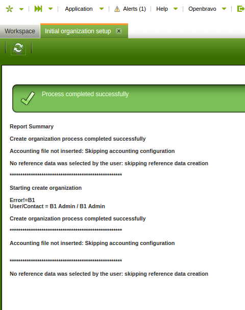 | Steps To Reproduce | As group admin role: Launch Initial Org Setup Process: Organization: B1 Organization Username: B1 Admin Organization type: Generic Parent organization: * Location/Address: Spain Include Accounting File or Accounting Reference Data: N Check in the success message Error!=B1 appears instead of Organization=B1 (attached an image) | |||||||