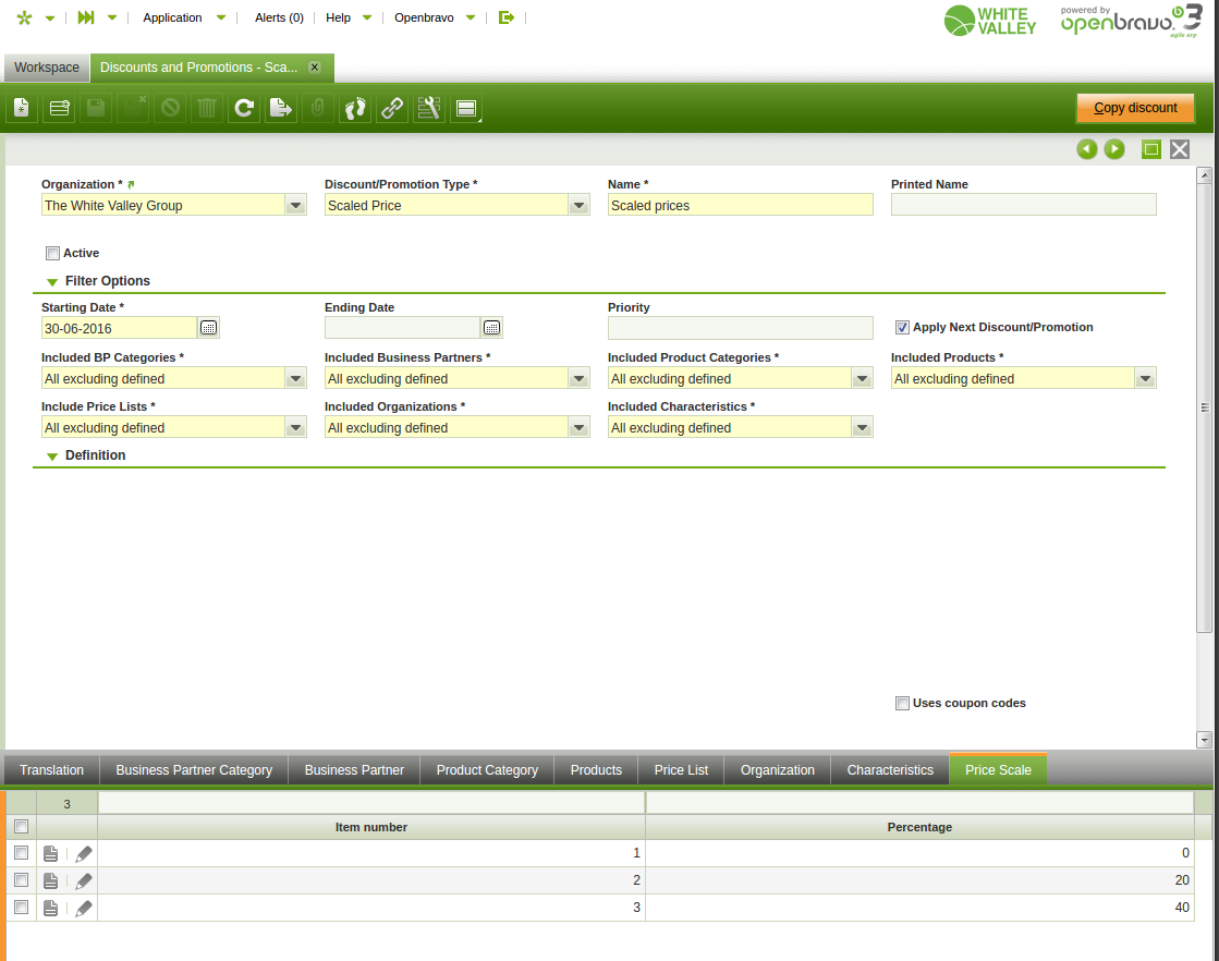 2. Configure promotion: Scaled Prices (See: ErpPromoScaled.png)