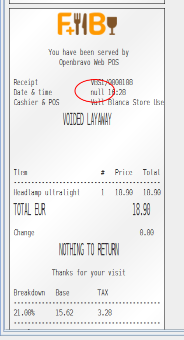 | Steps To Reproduce | 0-Use hardware manager to check the printer tickets. 1-Add 1x Headlamp ultralight to the receipt. 2-In dropdown menu, click "Layaway this Receipt". 3-Tap Total Amount button and layaway this receipt. 4-In dropdown menu, go to "Layaways" and choose the just created layaway. 5-In dropdown menu, click "Void this Layaway" and click in Done to void it. DEFECT: Check in the ticket in "Date & time" it is shown null and the time. So date is null. | |||||||
