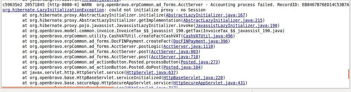 | Steps To Reproduce | As system admin role: Install the Cash VAT Management module As group admin role: Create a tax rate. Configure its accounting for Cash VAT: Tax Due Transitory Tax Credit Transitory Set it as Cash VAT Create three purchase orders, set them as Cash VAT and select the previously created tax rate Create three purchase invoices from them Create a Payment Out and pay the three invoices Try to post the payment out and check the following error message is shown: Process failed during execution The log shows: org.hibernate.LazyInitializationException: could not initialize proxy - no Session at org.hibernate.proxy.AbstractLazyInitializer.initialize(AbstractLazyInitializer.java:167) at org.hibernate.proxy.AbstractLazyInitializer.getImplementation(AbstractLazyInitializer.java:215) at org.hibernate.proxy.pojo.javassist.JavassistLazyInitializer.invoke(JavassistLazyInitializer.java:190) at org.openbravo.model.common.invoice.InvoiceTax_$$_javassist_194.getTax(InvoiceTax_$$_javassist_194.java) at org.openbravo.erpCommon.utility.CashVATUtil.createFactCashVAT(CashVATUtil.java:496) at org.openbravo.erpCommon.ad_forms.DocFINPayment.createFact(DocFINPayment.java:396) at org.openbravo.erpCommon.ad_forms.AcctServer.postLogic(AcctServer.java:1111) at org.openbravo.erpCommon.ad_forms.AcctServer.post(AcctServer.java:804) at org.openbravo.erpCommon.ad_forms.AcctServer.post(AcctServer.java:720) at org.openbravo.erpCommon.ad_actionButton.Posted.processButton(Posted.java:273) at org.openbravo.erpCommon.ad_actionButton.Posted.doPost(Posted.java:104) ... | |||||||