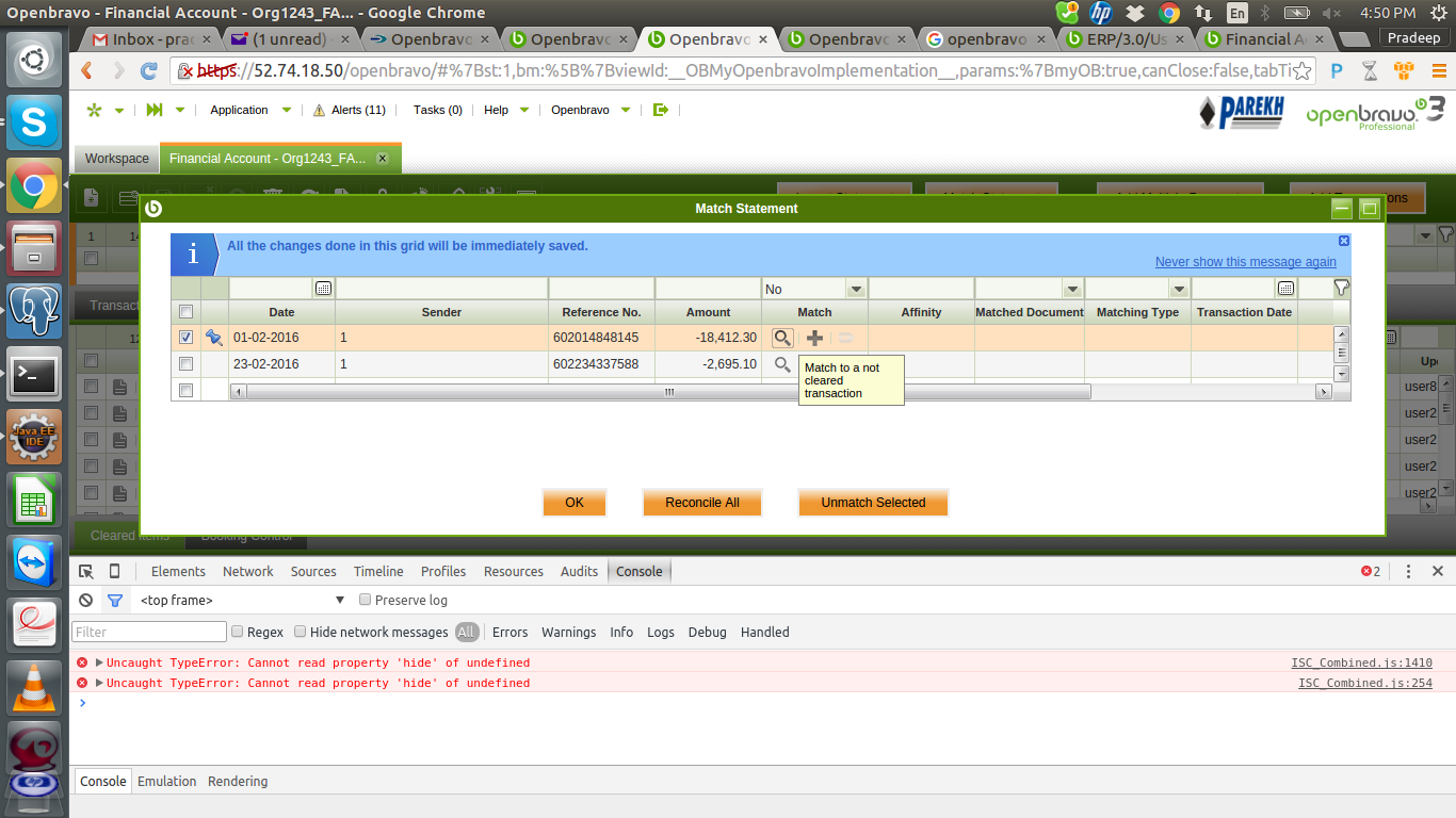 | Description | While doing manual reconciliation, the user had to click multiple times on the magnifier button in order to match with books transactions. Kindly find the attached image that shows the error noticed in developers tool. | |||||||||||