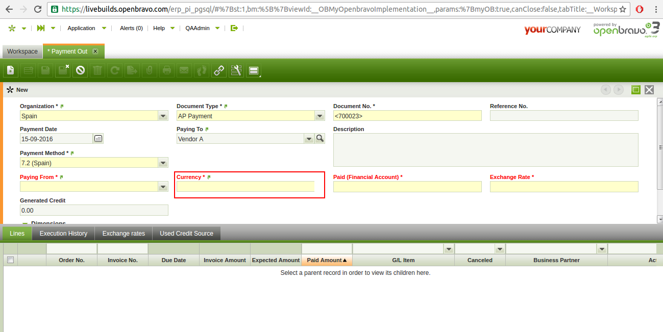 | Steps To Reproduce | 0-Login ERP as QAAdmin. 1-Go to the "Financial Account" window and select the "Spain Bank" account. Uncheck the "Active" checkbox 2-Go to "Payment Out" window. 3-Click "Create a new record in a form" button. 4-In "Paying To" field, select "Vendor A". 5-In "Payment Method" field select "7.2 (Spain)". DEFECT: Realise that the Currency field is not displayed properly. (check attached image). | ||||||||||