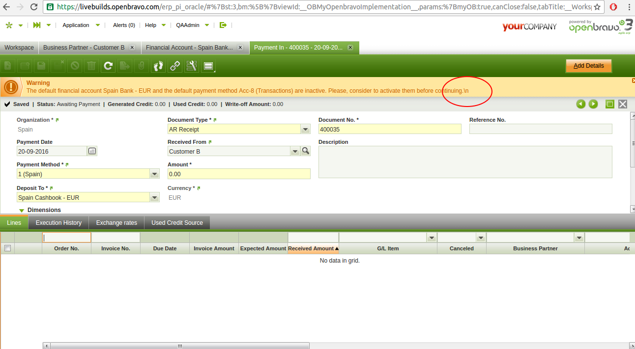 | Steps To Reproduce | 0-Login ERP as QAAdmin. 1-Go to "Business Partner" window and select "Customer B". Go to "Customer" tab and set the following values: -- "Payment Method": Acc-8 (Transactions) "Financial Account": Spain Bank -- Save. 2-Go to "Financial Account" window. Watch "Spain Bank" in form view and set "Active" as false. Save. 3-Go to "Payment Method" tab and set "Active" as false. Besides, set "Payment In Allowed" as true and "Receive Payments in Multiple Currencies" as true. 4-Go to "Payment In" window, create a new record in form view and, in "Received From" field, choose "Customer B". DEFECT: The warning message is shown and "\n" is visible at the end of the message. | |||||||