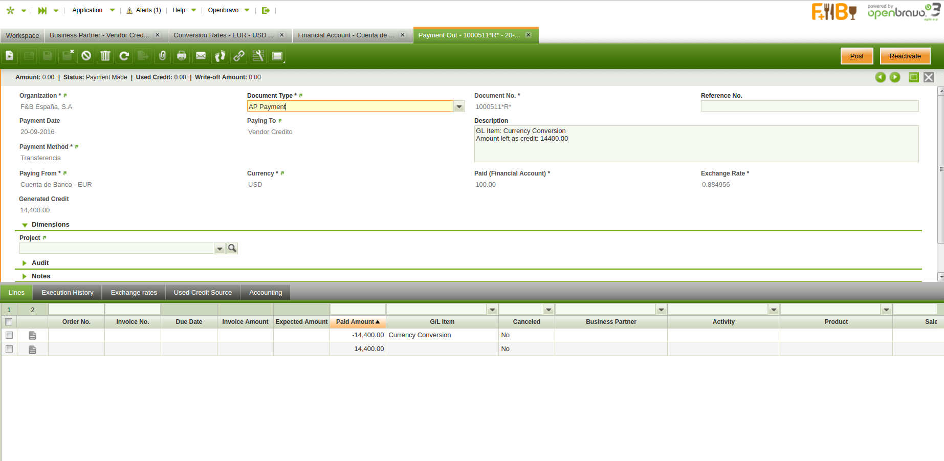 | Steps To Reproduce | Create a vendor named Vendor Credito in F&B España. Assign a purchase price list in EUR (Tarifa Bebidas Alegres). Payment Method Transferencia set up to allow making payments in other currencies. Financial account Cuenta de Banco. Enter a payment term and a location. Save it. Go to Payment Out window and create a new one. Select the new vendor, enter a Generated Credit amount of 100.00 €. Press Add Details. Do not select any invoice but just leave the credit to be used later. Press Done. Go to business partner window and select the vendor. Run Set New Currency process. Enter USD as new currency and enter also a conversion rate and a G/L item. Press Ok. Go to payment out window and realize that the payment in USD with an amount of 0.00 does not have a number with *R* | |||||||