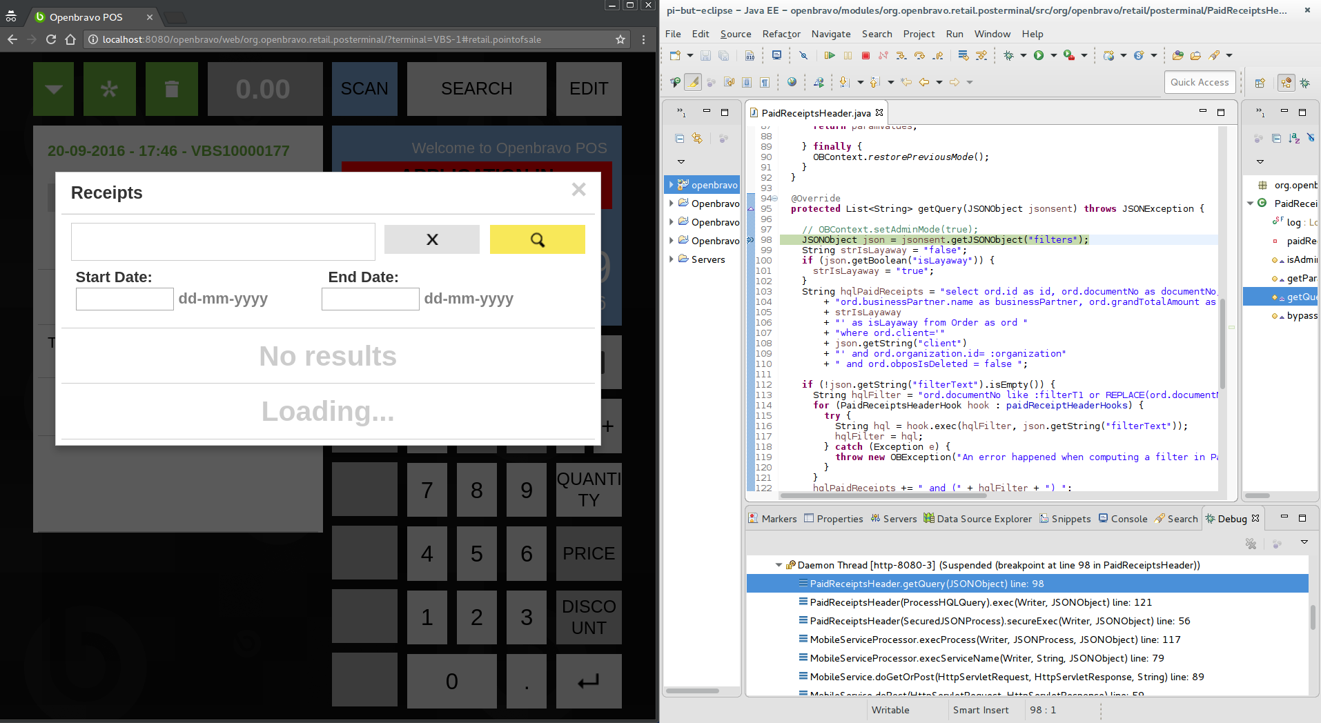 | Steps To Reproduce | Start Openbravo in debug mode and put a breakpoint in the class PaidReceiptsHeader in order to simulate a very slow data load. Login in Web POS. Select the menu option "Receipts" and tap on filter to load all the receipts. Observe that the breakpoint is reached and the web POS dialog shows "Loading..." Tap on "X" to clear the filter and observe the two messages appear: *Loading...* and *No results*. See attached screenshot. | |||||||