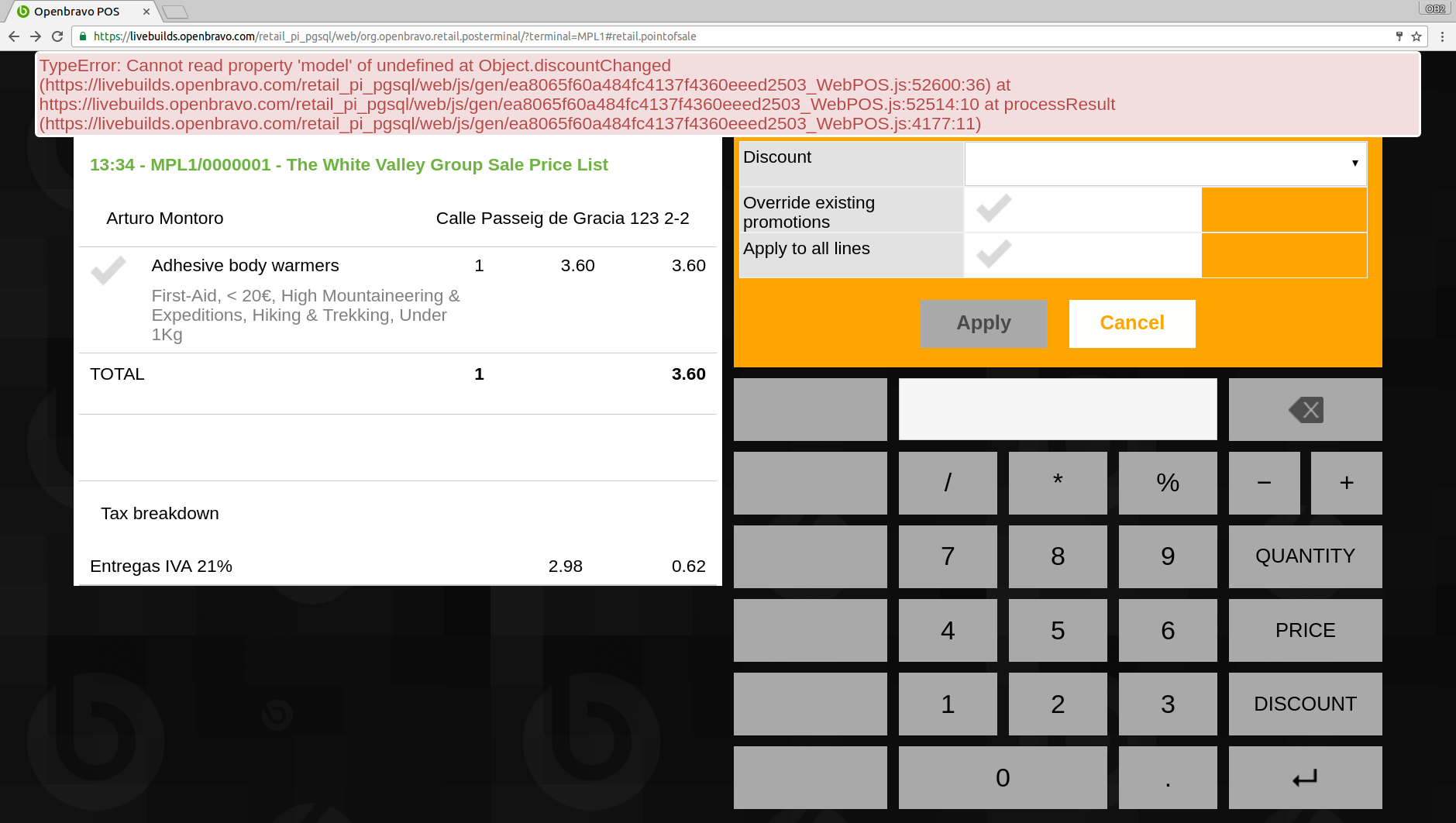 | Steps To Reproduce | backend: . go to discounts and promotions window . disable the next three discounts: disc_5_var_euro disc_fixed_5_euro disc_fixed_5_perc . modify discount disc_5_var_euro: .include price list: Only those defined . tab pricelist: new record: Sale Price List Customer VIP in terminal MPL1 . new receipt . add line . click in "receipt discounts" option in menu JS Error is returned: Cannot read property 'model' of undefined at Object.discountChanged | |||||||