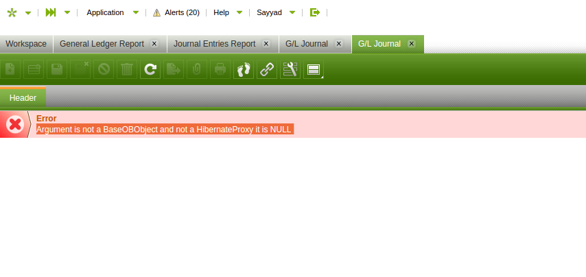 | Steps To Reproduce | 1. Add the transaction in Simple G/L Journal, Credit to 'Freight', debit to CASH 2. Process & Post the Simple G/L Journal 3. Open the General Ledger Report. 4. From Date, to Date should be date in between 'Accounting Date' selected in Simple G/l journal 5. Choose from Account & To account as 'Freight' & click on Search 6. Transaction will get listed, 7. Select Transaction done in step 1, click on Date column. 8. Journal Entries Report will open up, click on Entry number it should navigate to Simple G/l journal window. It will navigate to G/l journal window with error -> Argument is not a BaseOBObject and not a HibernateProxy it is NULL On Live build it just show blank tab. | |||||||