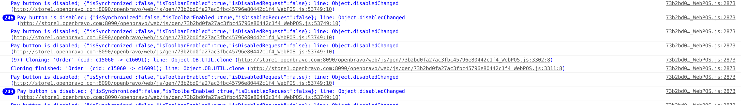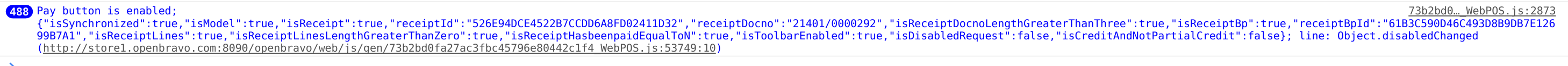 | Steps To Reproduce | Create 2 open tickets Open the developer console log Do pay open tickets Notice that almost 1000 times the same message is printed Pay button is disabled; {"isSynchronized":false,"isToolbarEnabled":true,"isDisabledRequest":false}; line: Object.disabledChanged Put a breakpoint in the right place to see the stacktrace life, the disableChanged method is called from several places. | |||||||