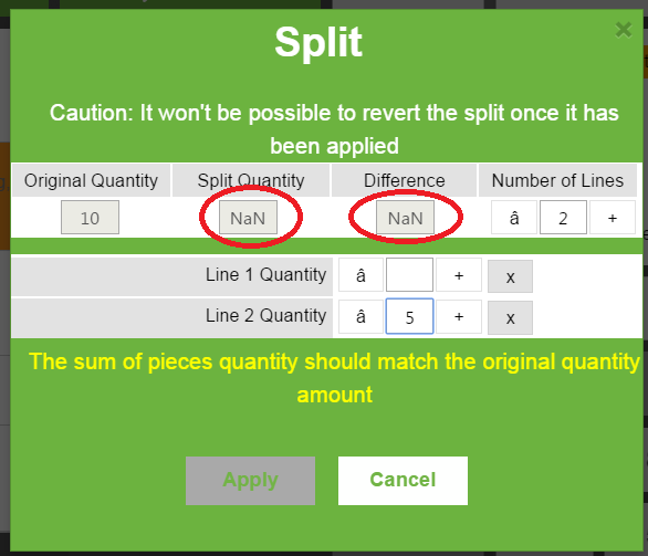 | Description | When splitting lines, if a quantity for a line is left blank, a NaN message is shown in both header fields "Split Quantity" and "Difference". See steps. | |||||||