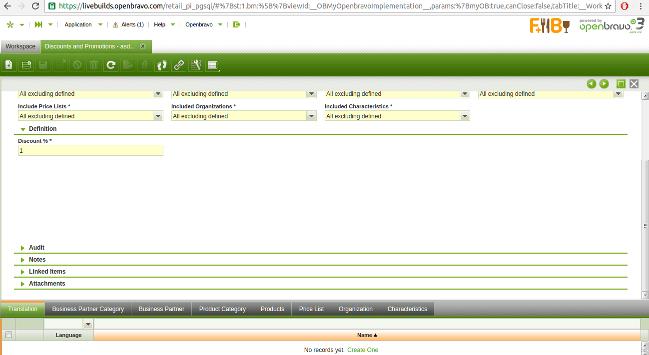 | Steps To Reproduce | 0-Login POS backend and, using "F&B International Group Admin" role, go to "Discounts and Promotions" window. 1-Create a new record in form view and fill the fields with the following values: -- Discount/Promotion Type: Fixed Percentage Discount Name: Test Starting Date: 01/01/2016 -- Save the record. 2-Go to Definition section and collapse it. Now, expand it again. DEFECT: Realise there a too much space for only one input field. | ||||||||||