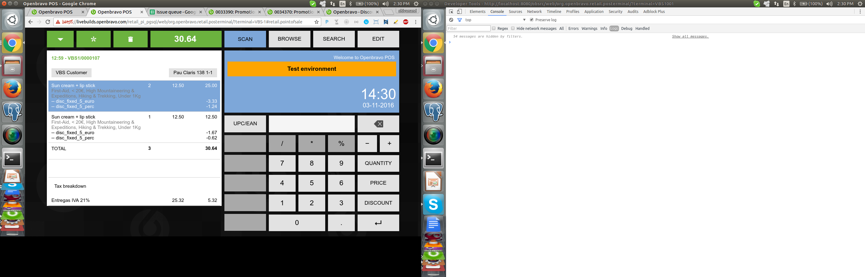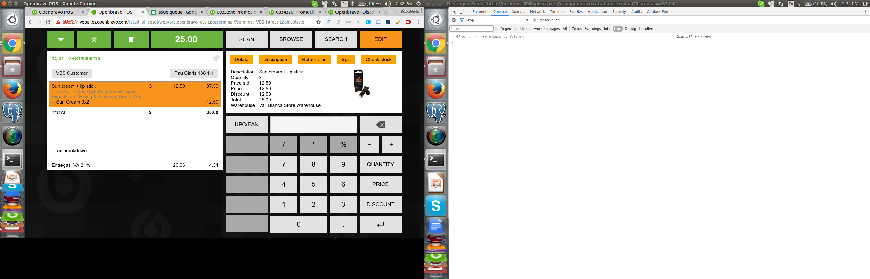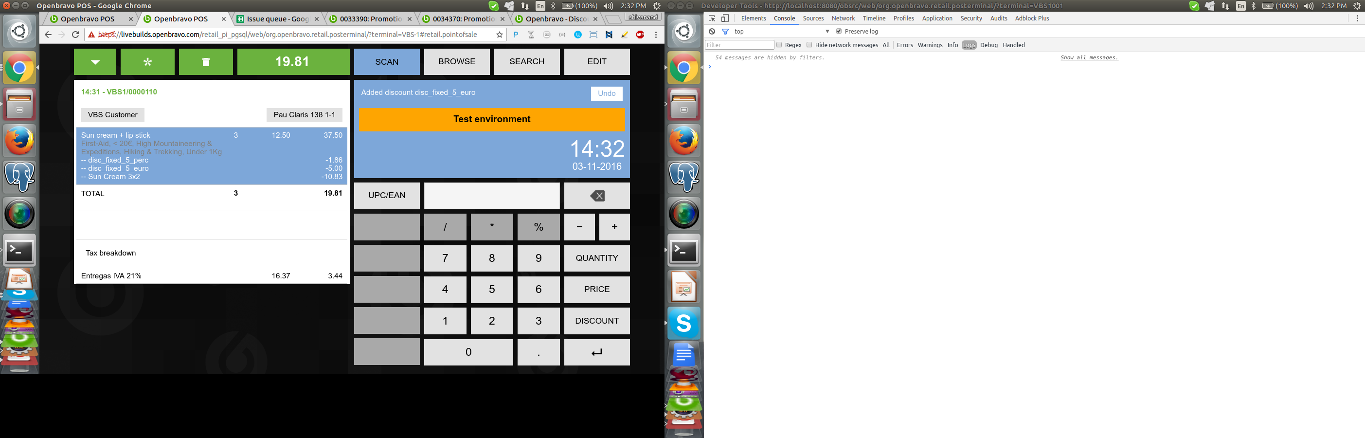 | Steps To Reproduce | 1)Login into webpos https://livebuilds.openbravo.com/retail_pi_pgsql/web/org.openbravo.retail.posterminal/?terminal=VBS-1 [^] 2) Add three units of "Sun Cream + lipstick". observe here ,the automatic discount which added to this receipt . for reference see attached image "beforeaddingmanualdiscounts.png" 3) click on receipt discounts from menu 4) select discount "disc_fixed_5_euro" and apply it 5) select discount "disc_fixed_5_perc" and apply it 6) select the line and tap on split and apply it . 7) Observe that the "the automatic discount has been removed off from the receipt" find the attachments 1)before split 2)after split | |||||||