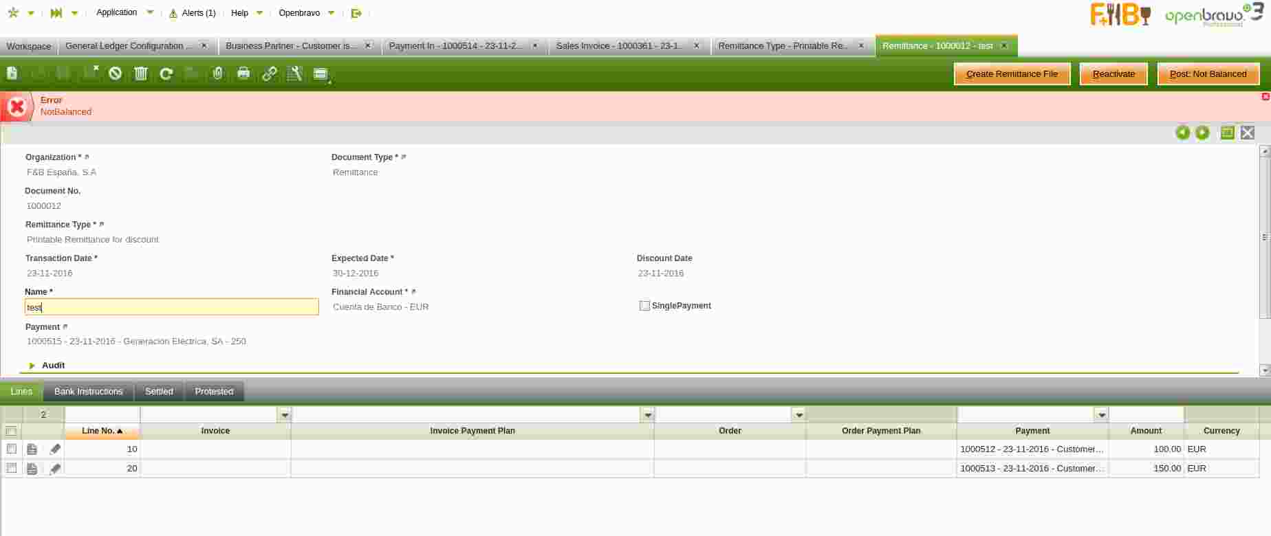 Issue verified by following below detailed repro-steps: - Go to General ledger configuration, General Accounts tab. Make sure that Suspense Balancing use is not selected for both F&B España Eur general ledger and for F&B International Group US Dollar. - Install Remittance infrastructure module and apply remittance dataset to F&B España organization. - Go to G/L Item window and create a new one with below setup: Name = Discount Risk Go to Accounting tab and enter below accounts for F&B España Euro general ledger: Debit acc = 52080 Credit acc = 52080 And below ones for F&B International Group US Dollar Debit acc = 1190 Credit acc = 1190 - Go to Remittance type window and create a new one with below setup: Name = Printable Remittance for discount Payment method = remittance Remit for discount = Yes Payment Method for discount = Transferencia G/L Item = select G/L item "Discount Risk", just created. Posting allowed = Yes Go to Accounting tab and enter below accounts for F&B España General Ledger Settlement Acc = 57200 Sent Acc = 43110 And for F&B Internation Group US Dollar: Settlement Acc = 1110 Sent Acc = 1510 Go to Financial Account window and select Cuenta de Banco. Verify Remittance is listed in the tab Payment Method. Create a new business partner, configured as a Customer, as described below: Price List = Tarifa de Ventas Payment Method = Transferencia payment terms = 30days Financial Account = Cuenta de Banco Enter any Location in Spain, in Location/Address tab. Go to Payment in and create a new payment for a 100 € of credit, for that customer. Go to Payment in and create a new payment for a 150 € of credit, for that customer Go to Sales invoice and create a new sales invoice for that customer for a total amount of 250.00. Complete and Post the invoice Go to payment in and create a new one, therefore the sales invoice created is paid by using the available credit. Go to Remittance window and create a new one with below setup: Remittance Type = Printable Remittance for discount Transaction date = today Expected date = 30-12-2016 Discount date = today Press Select Payments, remove the filters and select the two credit payments of 100 and 150. Process the remittance Try to post it. Error attached is then showed. |