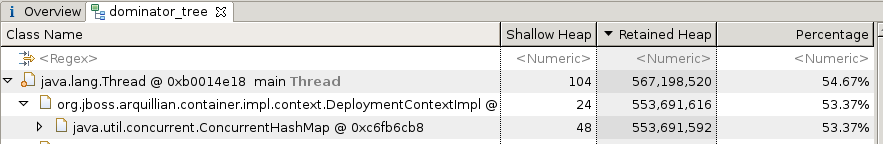 | Description | Recently several jobs in ci running the pi junit tests started failing with OOM errors. i.e. but-qa-multiserver but also mod-functional-basic However no error has been seen yet in normal pi or retail. All those junit tests run since a long time (several years) with ANT_OPTS setting memory to 1280MB (long time ago we increased that from 1024MB) The problem can be easily reproduce manually run by all tests i.e. in latest snapshot-but-qa-multiserver Live view with i.e. visualvm shows that maybe in middle of time taken very high GC cpu activity is seen + nearly all heap is full. Taking heap-dump at that moment show the probably culprit clearly: Class Name | Shallow Heap | Retained Heap | Percentage -------------------------------------------------------------------------------------- java.lang.Thread @ 0xb0014e18 main Thread| 104 | 567,198,520 | 54.67% -------------------------------------------------------------------------------------------------------------------------- org.jboss.arquillian.container.impl.context.DeploymentContextImpl @ 0xc6fb6ca0| 24 | 553,691,616 | 53.37% -------------------------------------------------------------------------------------------------------------------------- java.util.concurrent.ConcurrentHashMap @ 0xc6fb6cb8| 48 | 553,691,592 | 53.37% ----------------------------------------------------------------------------------------------- So some part using weld via arquillian takes up >50% of the available heap which seems excessive. Dominator view of retained memory points to that concurrent HashMap called 'stores'. Unclear what exactly is contained in there. Note: The snapshot used has a change to beans.xml weld-config to remove the exclude for org.openbravo.erpCommon.utility.* That maybe could be a trigger for higher memory use (just an idea). That would not explain the issue in the mod-functional-basic though. | |||||||