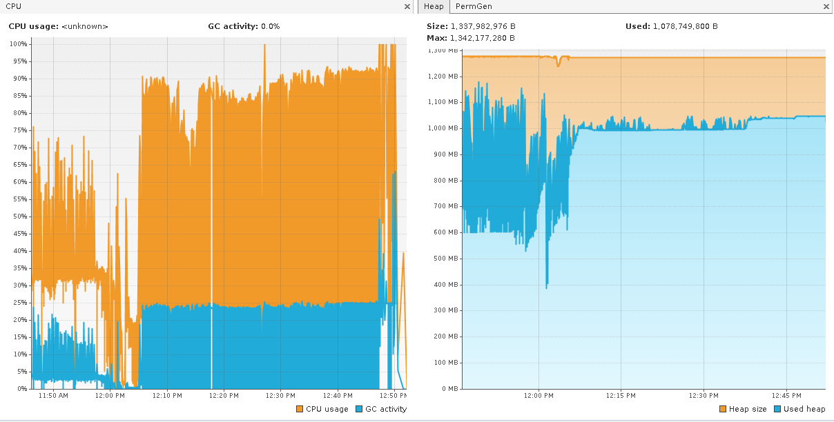 Selection_003 is screenshot of visualvm view of gc cpu usage % and memory usage which clearly shows when the problem triggers. |
