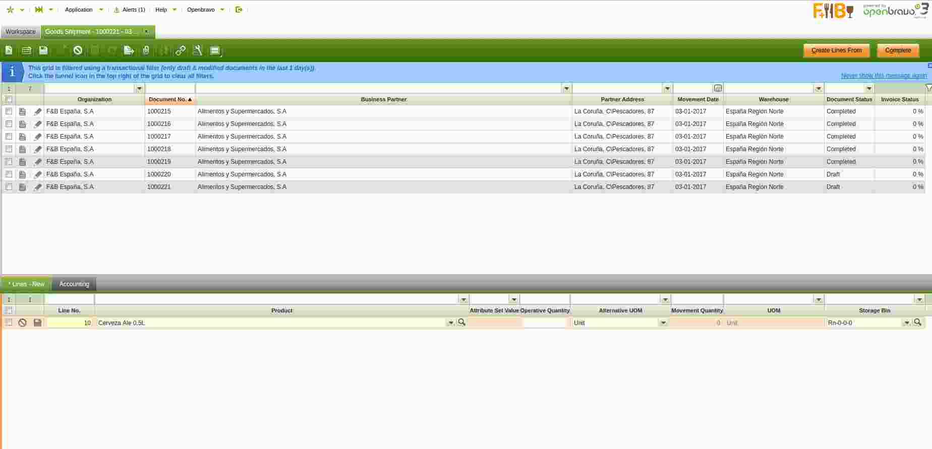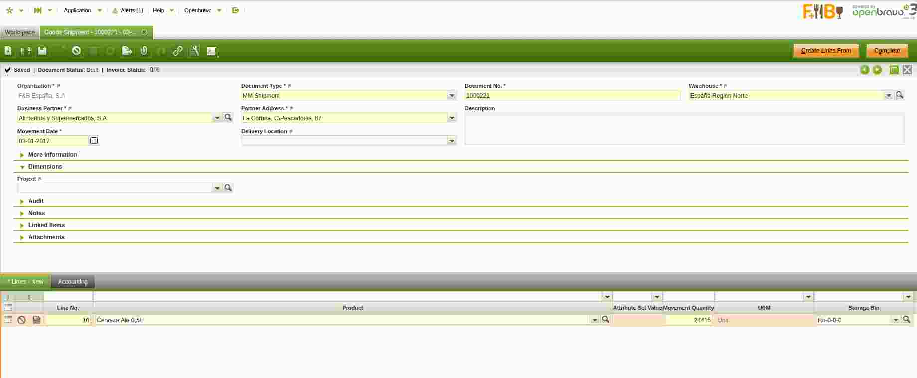 Test Plan As F&B España Group Admin: 1.- Go to Goods Shipment window and create a new one for F&B España, Alimentos y Supermercados business partner. 2.- Go to lines and create a new one. 3.- Click on product field, down arrow and select "Cerveza Ale 0.5L". 4.- Verify that Movement Qty field is "automatically" updated with 35915. 5.- Remove that line and close Goods Shipment form and leave session. As System Admin role. 1.- Go to Preference window and create a new record with below setup: Client = System. Organization = * Property = Enable UOM Management. Value = Y Visible at = all empty. Save it. As F&B España Group Admin: 1.- Go to Goods Shipment window and create a new one for F&B España, Alimentos y Supermercados business partner. 2.- Go to lines and create a new one. 3.- Click on product field, down arrow and select "Cerveza Ale 0.5L". 4.- Verify that Operative Quantity = Movement Quantity = 35915. 5.- Verify thal Alternative UOM = Unit |