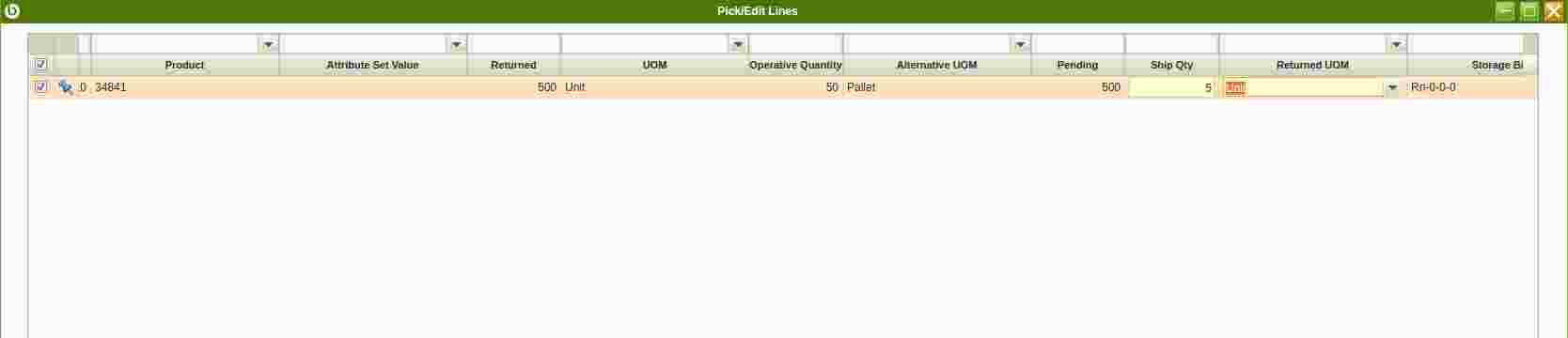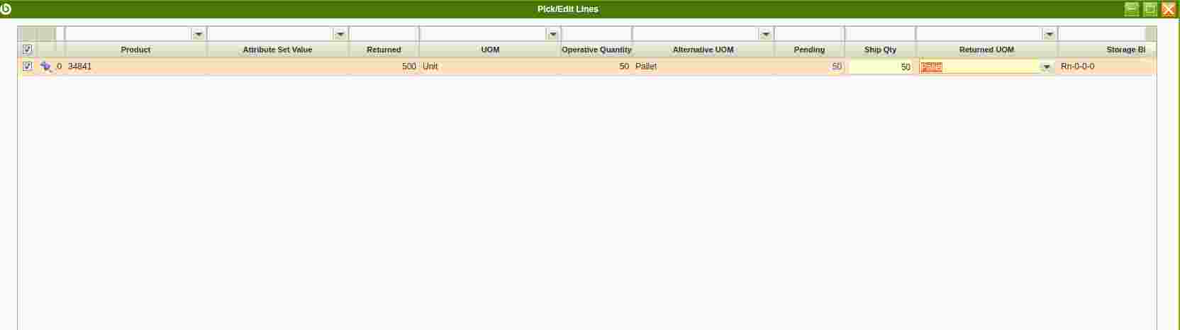 | Description | RTV shipment (Pick/Edit Lines) not properly working if Returned UOM is changed from Unit to Pallet. | |||||||