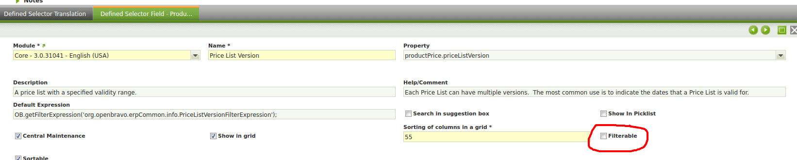 | Description | Defined selectors have a flag "Filterable" that allows to filter by this column in the selector's grid view. The same selector can be used in different columns belonging to different tables and tabs. Depending on the tab, the functional requirement might require the selector's field to be filterable or not. With the current "Filterable" flag we force the field to be filterable or not always, regardless the tab from which it has been opened. It would be useful to be able to define the filterable capability based on an expression, in a similar way it's done, for example, for the Default Expression. | |||||||||||