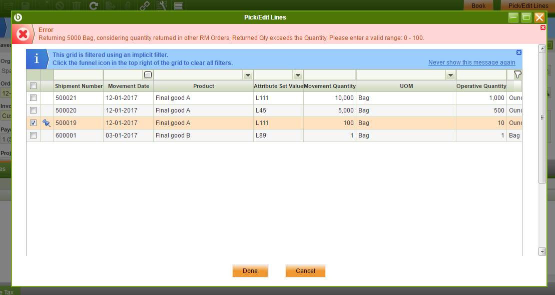 Returning 5000 Bag, considering quantity returned in other RM Orders, Returned Qty exceeds the Quantity. Please enter a valid range: 0 - 100.