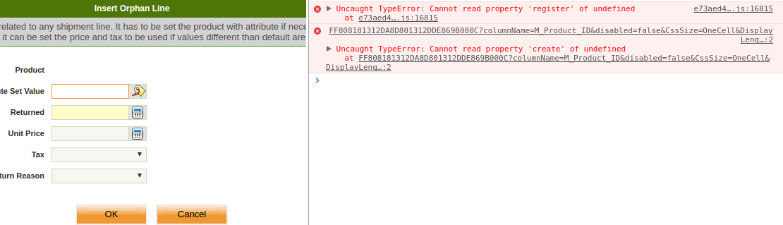 | Steps To Reproduce | 1. Create a preference 'RM Allow Orphan Line' with value 'Y' 2. Log in again 3. Create a new record in Return from Customer window 4. Click on Insert Orphan line -> ERROR: * realize it's not possible to select a product as the product selector is not available. * JS error can be seen in console | |||||||