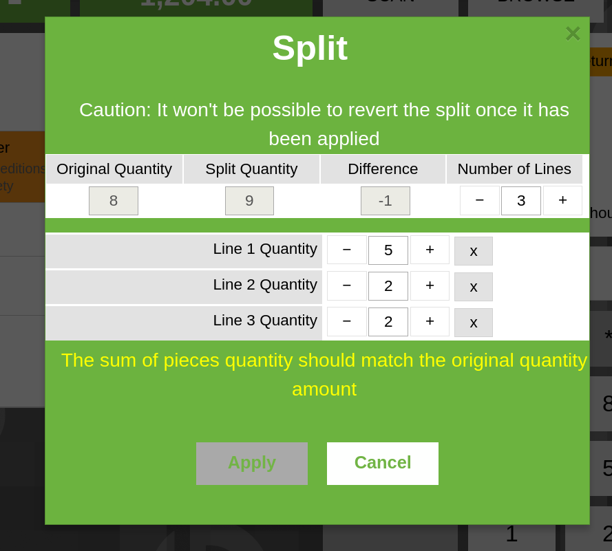 | Description | Inside the Split Lines popup, when the error "The sum of pieces quantity should match the original quantity amount" is shown, there is not right margin. That one is the only non existent margin. | |||||||||||