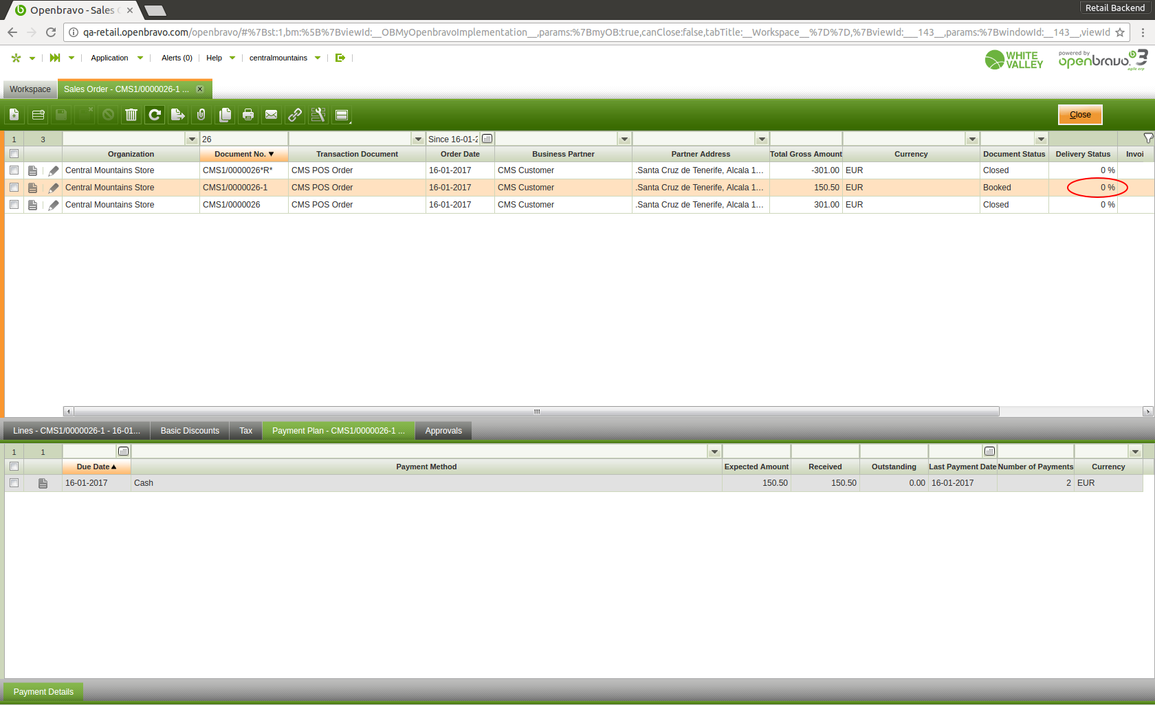 2. Notice how the Delivery Status of the Sales Order with Document No. of the original receipt followed by "-1" is "0%" (step 8)