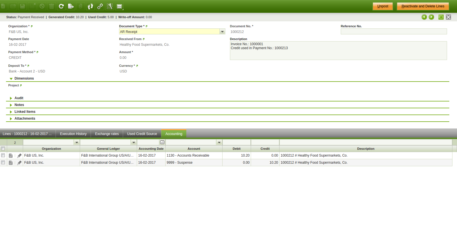 Steps To Reproduce1- In backend, go to Payment Method and create a new one, called for example “CREDIT” and having the checks of Payment In allowed and Automatic Receipt. Select “Automatic” as Execution Type, “Leave as credit” as Execution Process, uncheck the Deferred option and select “In transit Payment Account” as Upon Receipt Use.