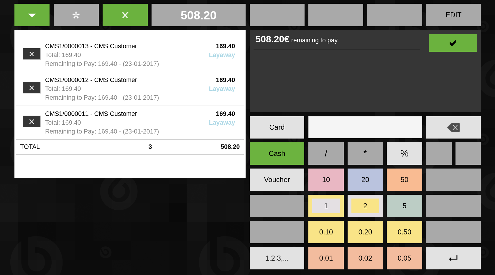 | Steps To Reproduce | 0. Log in the Web POS as user "vallblanca" 1. Create more than one Layaway with the following steps 1.1. Click on the Browse button and select some products (p.e., "Avalanche transceiver" and "Headlamp ultralight") 1.2. Click on the Total button (should be shown as "169.40") 1.3. Open the dropdown menu and select the "Layaway this Receipt" option 1.4. Click on the "Layaway" button to complete the receipt 2. Select "Pay Open Tickets" option from the dropdown menu 2.1. Click on the search magnifying glass and select all the created layaways 2.2. Click on "Done". Testing the validations mentioned in the description on the "Pay Open Tickets" screen 3. Click on a Layaway to open the "Amount to Layaway" popup | Set the values and click on 'Apply' 3.1. Type in '&%50', '%50&', '&50%' , '50%&', '%50%' to check [1.3] 3.2. Type in '&40', '&40.', '&40.1' '&40.15', '&40&', '&40.&', '&40.1&' '&40.15&' to check [2.1] 3.3. Type in '40&', '40.&', '40.1&' '40.15&' to check [2.2] 3.4. Type in '%35', '35%' to check [2.3] | |||||||||||