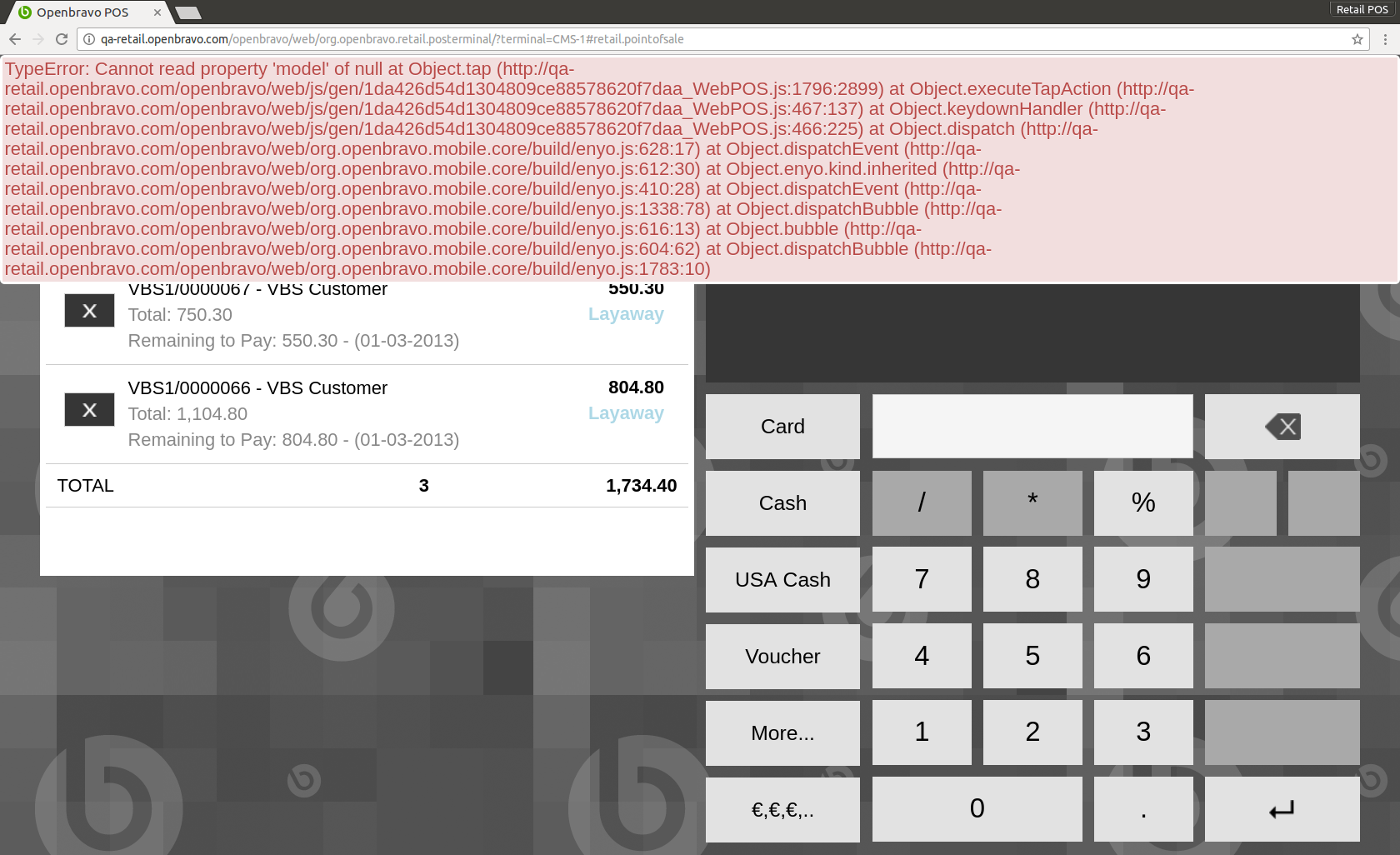 | Steps To Reproduce | 0. Log in the Web POS as user "vallblanca" 1. Create more than one Layaway with the following steps 1.1. Click on the Browse button and select some products (p.e., "Avalanche transceiver" and "Headlamp ultralight") 1.2. Click on the Total button (should be shown as "169.40") 1.3. Open the dropdown menu and select the "Layaway this Receipt" option 1.4. Click on the "Layaway" button to complete the receipt 2. Select "Pay Open Tickets" option from the dropdown menu 2.1. Click on the search magnifying glass and select all the created layaways 2.2. Click on "Done". 3. In the Pay Open Tickets window: 3.1. Click on a layaway - Amount to Layaway popup appears 3.2. Hit enter key. Notice how an Enyo error is shown (see attached screenshot). | |||||||
