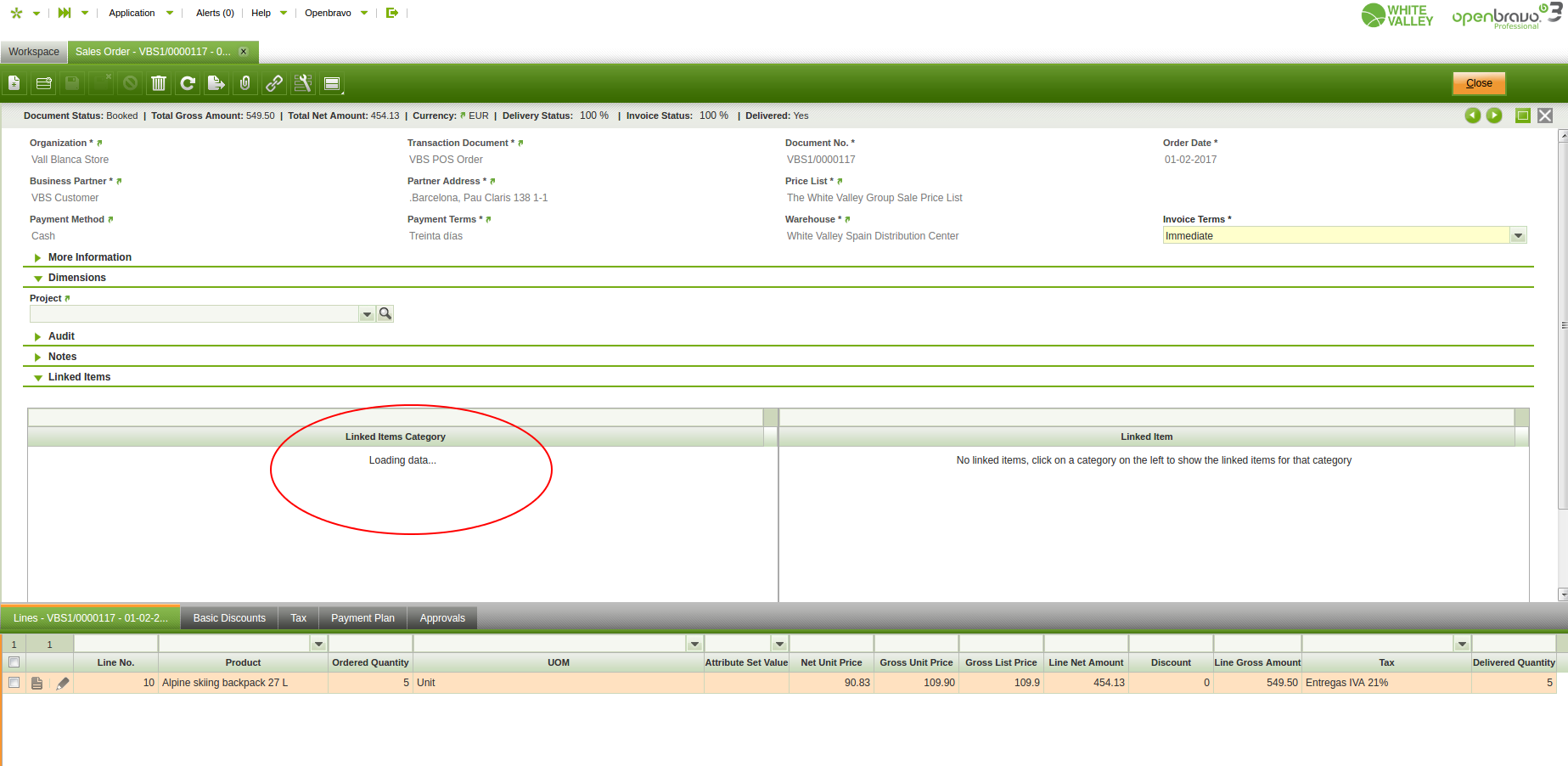 | Steps To Reproduce | 0-Login POS as vallblanca and complete a sales order. 1-Login POS Backend as Openbravo. 2-Using "The White Valley Group Admin" role, go to Sales Order window. 3-Open the previously created record and go to Linked Items section. DEFECT: Realise its loading process is never completed. | |||||||