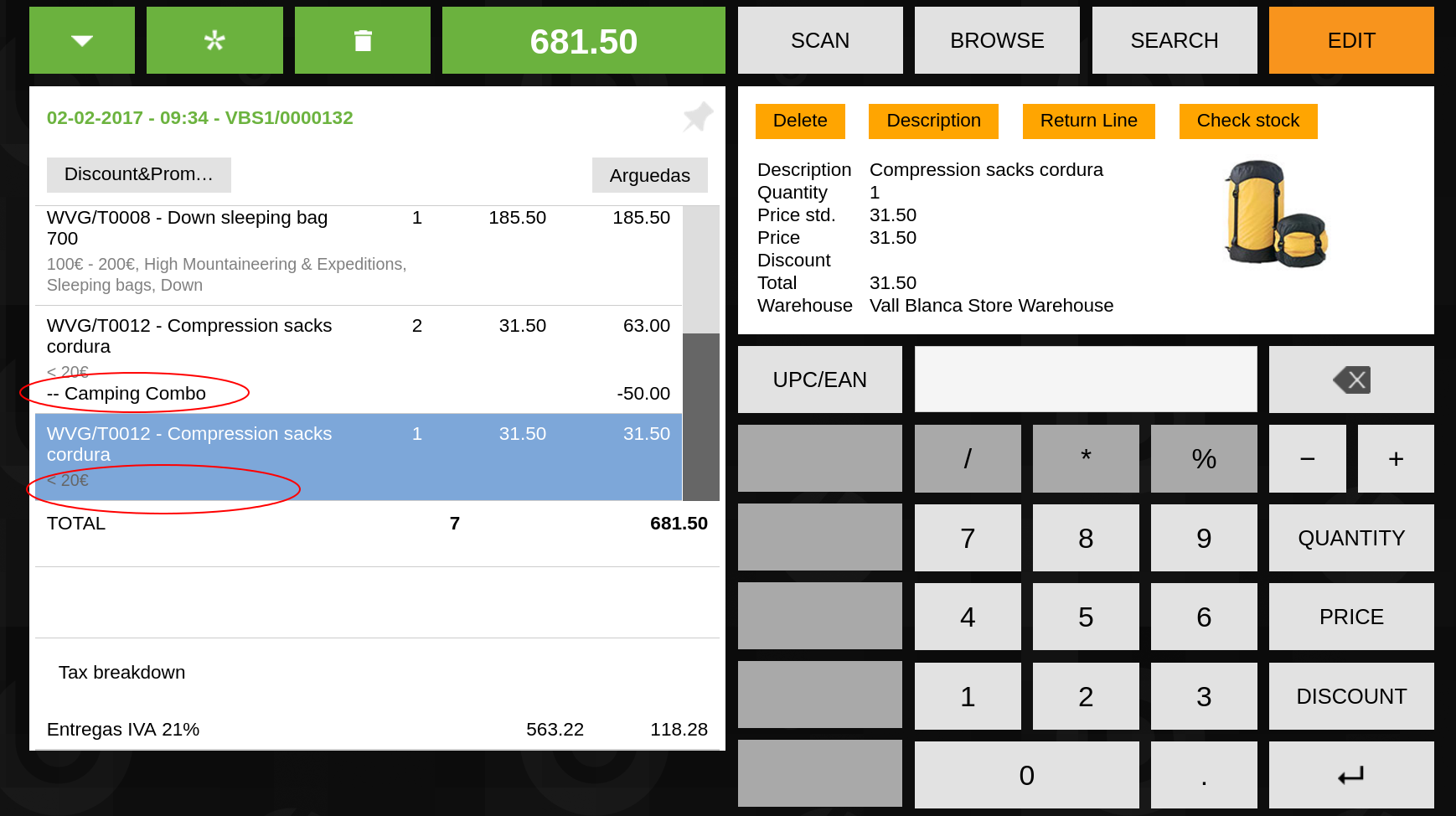 | Steps To Reproduce | Execute this test case: https://testlink.openbravo.com/testlink/ltx.php?item=exec&feature_id=23738&build_id=230 [^] --------- Log in ERP using below login credentials 'Username': Openbravo 'Password': openbravo Change the role to Group -Admin-The White Valley Group 1. Navigate to “Discount and Promotions” window 2. Create new record: a. Organization: The White Valley Group b. Discount/Promotion Type: Two Families Discount c. Name: Camping Combo d. Active: Yes e. Starting Date: Today f. Including Business Partners: Only those defined g. Save record 3. Select Tab: Business Partner a. Create a new record: - Business Partner: Discount&Promos 2 - Active: Yes - Save record 4. Select Tab: Families a. Create new record: - Name: Family 1 - Quantity: 1 - Discount Type: Fixed Discount - Fixed Discount: 0 - Save record b. Select Tab: Products in Family - Create new record (Product: Down sleeping bag 500) - Create new record (Product: Down sleeping bag 700) 5. Select Tab: Families a. Create new record: - Name: Family 2 - Quantity: 1 - Discount Type: Fixed Discount - Fixed Discount: 50 - Save record b. Select Tab: Products in Family - Create new record (Product: Down sleeping bag 500) - Create new record (Product: Compression sacks cordura) --------- After that test case, execute the following and realise that exected result 17 is not correct: https://testlink.openbravo.com/testlink/ltx.php?item=exec&feature_id=23739&build_id=230 [^] --------- Login to POS terminal, go to the login URL: http://{server}/{context}/web/org.openbravo.retail.posterminal/?terminal=VBS-1 [^] Enter login credentials: 'Username': vallblanca 'Password': openbravo 1. Change receipt Customer a. Push button (Receipt Customer): VBS Customer b. Type 'WVG/DP002' c. Click on 'Discount&Promos 2' 2. In right panel push a button SEARCH 3. Write 'WVG/M0019' item on search product filter 4. Click on 'Avalanche transceiver' item on search product result 5. In receipt panel, click item 'Avalanche transceiver' 6. In right panel change quantity a. Push button '3' b. Push button 'Quantity' 7. In receipt panel, click item 'Avalanche transceiver' 8. In right panel split line a. Push button 'Split' b. Push button 'Apply' to accept proposed split 9. In right panel push a button SEARCH 10. Write 'WVG/T0008' item on search product filter 11. Click on 'Down sleeping bag 700' item on search product result 12. Write 'WVG/T0012' item on search product filter 13. Click on 'Compression sacks cordura' item on search product result 14. In receipt panel, click item 'Compression sacks cordura' 15. In right panel change quantity a. Push button '3' b. Push button 'Quantity' 16. In receipt panel, click item 'Compression sacks cordura' 17. In right panel split line a. Push button 'Split' b. Push button 'Apply' to accept proposed split ~~~~~~~~~ Verify: In step 1: - Receipt Customer is 'Discount&Promos 2' In step 8: - Line: 'Avalanche transceiver' is splitted into 2 lines: * Units: 2, Amount: 301.00 * Units: 1, Amount: 150.50 - Receipt amount: 451.50 - Tax amount: 78.36 In step 13: - New lines added to receipt: * Down sleeping bag 700, Units: 1, Amount: 185.50 * Compression sacks cordura, Units: 1, Amount: 31.50, Discount (Camping Combo): -50.00 - Receipt amount: 618.50 - Tax amount: 107.34 In step 15: - Line 'Compression sacks cordura' is modified: * Units: 3, Amount: 94.50, Discount (Camping Combo): -50.00 - Receipt amount: 681.50 - Tax amount: 118.28 In step 17: - Line 'Compression sacks cordura' is splitted in 2 lines * Units: 2, Amount: 63.00, Discount (Camping Combo): -33.33 * Units: 1, Amount: 31.50, Discount (Camping Combo): -16.67 - Receipt amount: 681.50 - Tax amount: 118.28 --------- | |||||||||||