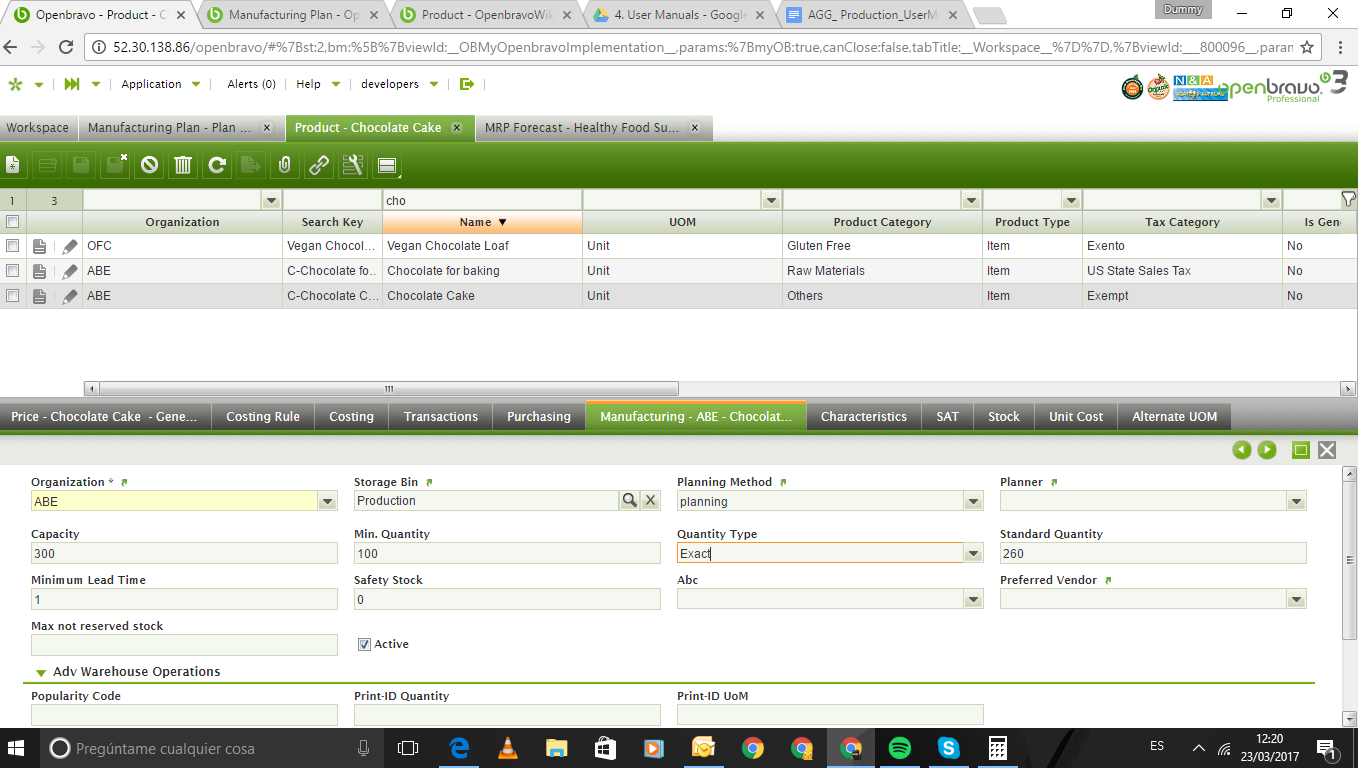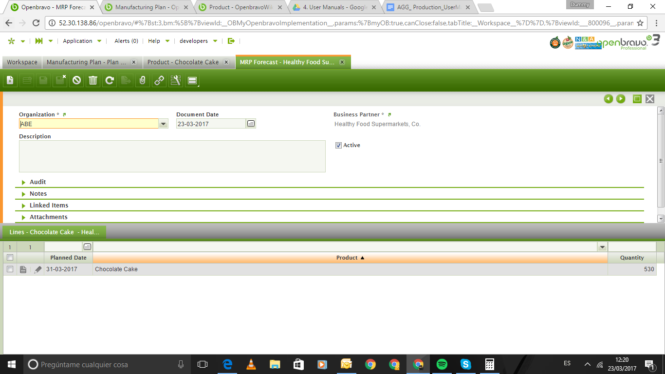 Test Plan Go to Planner window and create a new record: Name: Product Planner Go to Planning Method and create a new record: Name: Product Planning Method In Lines tab create a new record: Transaction type: Material Requirement Weighting: 1 In Lines tab create another record: Transaction type: Pending Purchase Order Weighting: 1 In Lines tab create another record: Transaction type: Pending Sales Order Weighting: 1 In Lines tab create another record: Transaction type: Pending Work Requirement Weighting: 1 In Lines tab create another record: Transaction type: Sales Forecast Weighting: 1 Go to Product window and create a new record: Search Key / Name: Product Production: Y Purchase: N In Price tab create a new record: Price list Version: Tarifa de ventas Unit Price / List Price: 8 In Price tab create another record: Price list Version: Tarifa Bebidas alegres Unit Price / List Price: 7 In Manufacturing tab create a new record: Storage bin: RN-1-0-0 Planning method: Product Planning Method Planner: Product Planner Capacity: 300 Min Quantity: 100 Quantity Type: Exact Standar Quantity: 260 Minimum Lead Time: 1 Safety Stock: 0 Go to Activity window and create a new record: Search Key / Name: Product Activity Go to Process Plan window and create a new record: Search Key / Name: Build Product In Version tab create a new record: Starting Date: 01-01-2016 Ending Date: 01-01-2018 In Operation tab create a new record: Search Key / Name: Product Operation Activity: Product Activity Multiplier: 1 In I/O Product tab create a new record: Product: Product Production Type: Product Production (P+) Quantity: 1 Go to MRP Forecast window and create a new record: Document date: today Business Partner: Alimentos y Supermercados, S.A In Lines tab create a new record : Planned Date: next week Product: Product Quantity: 530 Go to Manufacturing Plan and create a new record: Name: Test1 Time Horizon: 20 Safety Lead Time: 2 Product: Product Process the Manufacturing Plan and check One line of Suggested Work Requirement was created with quantity = 260, required quantity = 530 and total movement quantity = 260 One line of Suggested Work Requirement was created with quantity = 260, required quantity = 530 and total movement quantity = 520 One line of Suggested Work Requirement was created with quantity = 260, required quantity = 530 and total movement quantity = 780 One line of Sales Forecast was created with quantity/required quantity = -530 and total movement quantity = 250 Stock and Minimun Stock lines was created with quantity/required quantity/total movement quantity = 0 Go to MRP Forecast window and edit the previous line created with quantity = 200 Go to Manufacturing Plan and create a new record: Name: Test2 Time Horizon: 20 Safety Lead Time: 2 Product: Product Process the Manufacturing Plan and check One line of Suggested Work Requirement was created with quantity = 260, required quantity = 200 and total movement quantity = 260 One line of Sales Forecast was created with quantity/required quantity = -200 and total movement quantity = 0 Stock and Minimun Stock lines was created with quantity/required quantity/total movement quantity = 0 Go to MRP Forecast window and edit the previous line created with quantity = 50 Go to Manufacturing Plan and create a new record: Name: Test3 Time Horizon: 20 Safety Lead Time: 2 Product: Product Process the Manufacturing Plan and check One line of Suggested Work Requirement was created with quantity = 260, required quantity = 50 and total movement quantity = 260 One line of Sales Forecast was created with quantity/required quantity = -50 and total movement quantity = 210 Stock and Minimun Stock lines was created with quantity/required quantity/total movement quantity = 0 Go to the previous product created and edit the manufacturing plan created: Standard Quantity: 3 Go to MRP Forecast window and edit the previous line created with quantity = 100 Go to Manufacturing Plan and create a new record: Name: Test4 Time Horizon: 20 Safety Lead Time: 2 Product: Product Process the Manufacturing Plan and check 34 lines of Suggested Work Requirement was created with quantity = 3, required quantity = 100 and the last one with total movement quantity = 102 One line of Sales Forecast was created with quantity/required quantity = -100 and total movement quantity = 2 Stock and Minimun Stock lines was created with quantity/required quantity/total movement quantity = 0 Go to the previous product created and edit the manufacturing plan created: Standard Quantity: 20 Go to MRP Forecast window and edit the previous line created with quantity = 85 Go to Manufacturing Plan and create a new record: Name: Test5 Time Horizon: 20 Safety Lead Time: 2 Product: Product Process the Manufacturing Plan and check 5 lines of Suggested Work Requirement was created with quantity = 20, required quantity = 85 and the last one with total movement quantity = 100 One line of Sales Forecast was created with quantity/required quantity = -85 and total movement quantity = 15 Stock and Minimun Stock lines was created with quantity/required quantity/total movement quantity = 0 Go to the previous product created and edit the manufacturing plan created: Standard Quantity: 3 Go to MRP Forecast window and edit the previous line created with quantity = 50 Go to Manufacturing Plan and create a new record: Name: Test6 Time Horizon: 20 Safety Lead Time: 2 Product: Product Process the Manufacturing Plan and check 34 lines of Suggested Work Requirement was created with quantity = 3, required quantity = 50 and the last one with total movement quantity = 102 One line of Sales Forecast was created with quantity/required quantity = -50 and total movement quantity = 52 Stock and Minimun Stock lines was created with quantity/required quantity/total movement quantity = 0 Go to the previous product created and edit the manufacturing plan created: Empty Quantity Type Standard Quantity: 260 Go to MRP Forecast window and edit the previous line creat