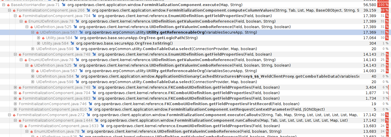 Problem seems to be in FormInitializationComponent: DEBUG org.openbravo.client.application.window.FormInitializationComponent - Elapsed time: 44852(26,0,3,0,24499,20315,0,1,0,2) (t6 - t5) -> computeColumnValues -> 24499 (t7 - t6) -> executeCallouts and computeAuxiliaryInputs -> 20315 There are no auxiliary inputs defined for this tab. There are no complex default values. There is only one callout (SE_PaymentMethod) which only takes around 2 ms to be executed. |
