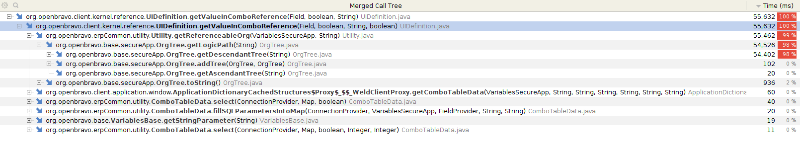 Repository: erp/devel/pi Changeset: d9446ef6dac015006bff72fbc4787357b59b8a7e Author: Asier Lostalé <asier.lostale <at> openbravo.com> Date: Wed May 03 14:15:41 2017 +0200 URL: http://code.openbravo.com/erp/devel/pi/rev/d9446ef6dac015006bff72fbc4787357b59b8a7e [^] fixed bug 35729: OrgTree.getAccessibleTree is slow with many organizations Added some minor refactors on top of what was done for 0035590: * When inserting nodes, just prepend them, don't add position * Simplified some loops with for each statements * Improved toString method preventing String concatenations --- M src/org/openbravo/base/secureApp/OrgTree.java --- |